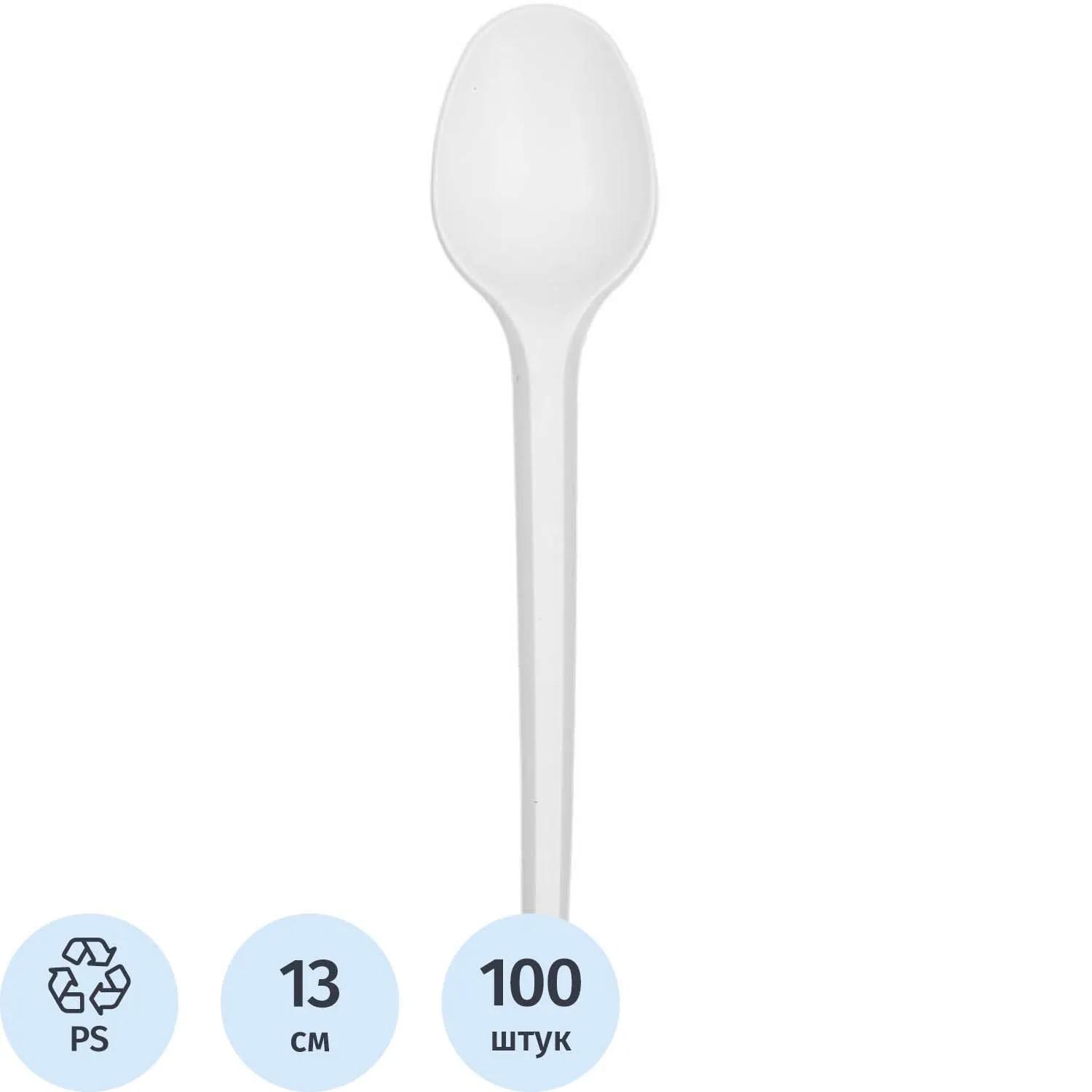 <strong>Ложка одноразовая чайная белая 130 мм 100 штук в упаковке. <BR></strong><BR>Данные одноразовые чайные ложки подходят как для холодных, так и для горячих напитков. <BR>Используются на предприятиях общественного питания, в дороге, на пикнике, в домашнем и офисном обиходе. <BR>Для изготовления использован высококачественный полистирол белого цвета, благодаря чему они легкие и не травмоопасные. <BR>Максимальная температура используемых пищевых продуктов 70°С. <BR>Длина — 130 мм. <BR>В упаковке 100 штук, в транспортном коробе 40 упаковок.