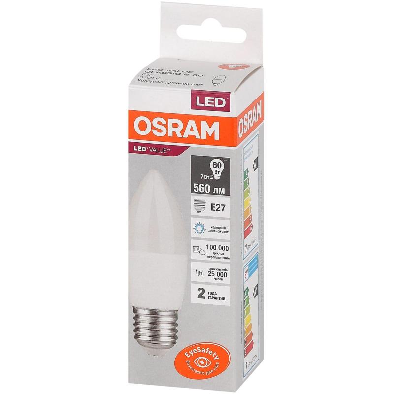 Лампа светодиодная Osram LED Value B, 560лм, 7Вт (замена 60Вт), 6500К (холодный белый свет). Цоколь E27, колба B, угол пучка 200°. Исполнение колбы матовое, пластик. Напряжение питания 220-240В. Товар сертифицирован.Внешний вид и/или характеристики товара могут быть изменены производителем в соответствии с производственным процессом.
