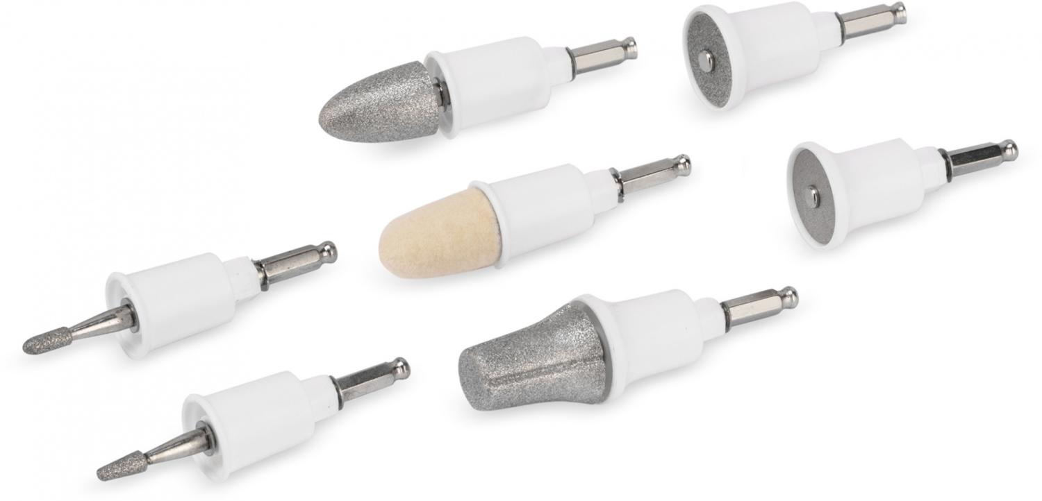 | Насадки | насадка для шлифовки ногтя, удаления натоптышей,огрубевшей кожи и мазолей на руках - 1 шт; цилиндрическая насадка для шлифовки основания ногтя - 1 шт; насадка для придания формы - 2 шт; войлочная насадка для полировки ногтя -1 шт.; малый диск дляй шлифовки - 1 шт.; большой диск шлифовки- 1шт. |