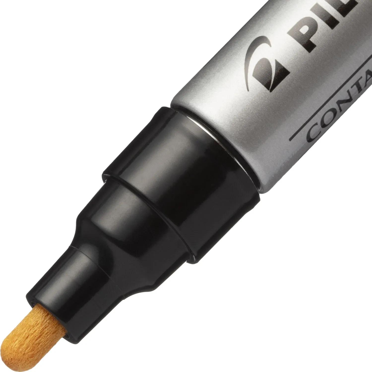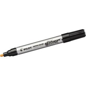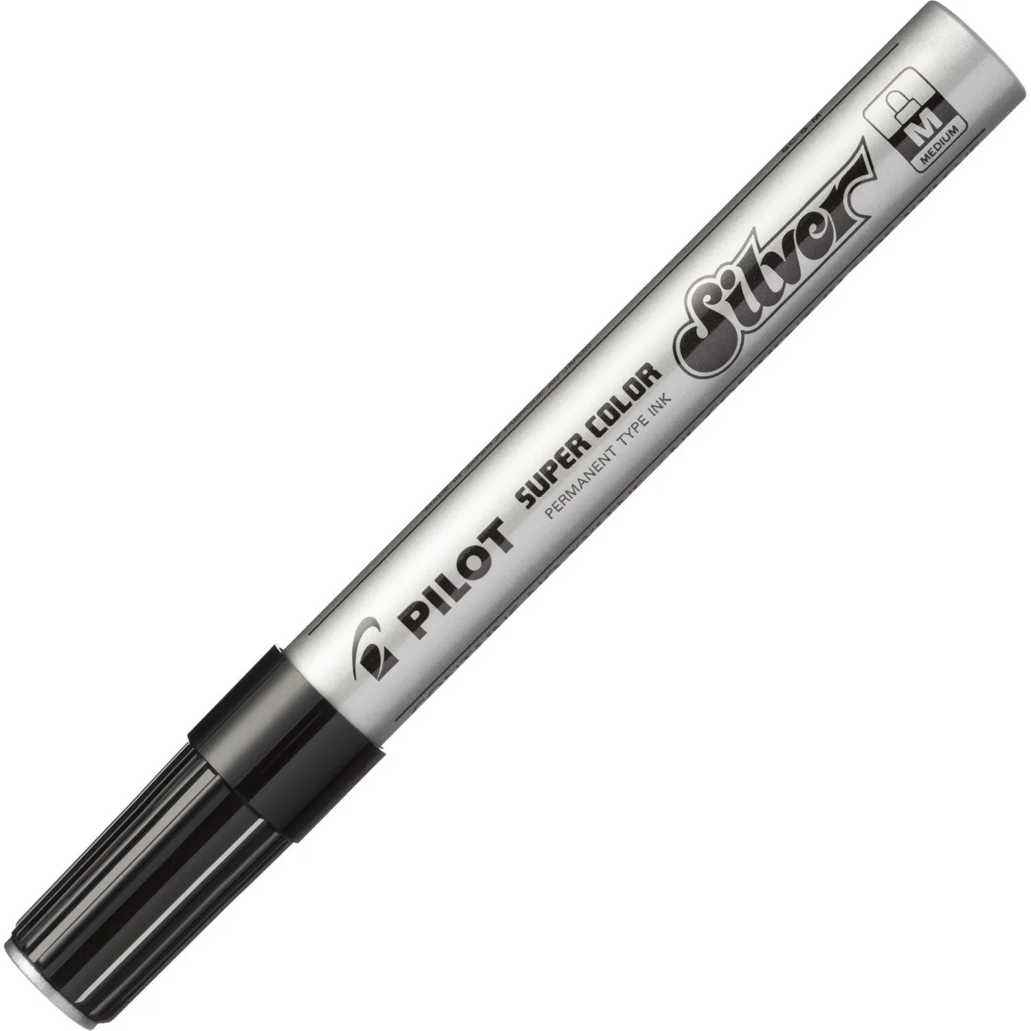 Маркер промышленный лаковый Pilot SC-S-M серебристый 2-5 мм<br><br>Промышленный лаковый маркер с серебряными чернилами предназначен для маркировки и оформления различных поверхностей, таких как стекло, металл, пластик, дерево, бетон и другие. Этот маркер идеально подходит для использования при оформлении плакатов и стенгазет, росписи по стеклу и керамике, а также для нанесения инвентарных номеров и маркировки деталей. Чернила на основе нитрокраски обеспечивают яркую и долговечную маркировку, которая устойчива к воздействию растворителей и внешним погодным условиям.<br><br>Маркер имеет круглый наконечник и обеспечивает толщину линии от 2 до 5 мм, что позволяет наносить как мелкие, так и более крупные надписи. Чернила быстро сохнут и не размазываются, а также хорошо видны на тёмных и гладких поверхностях. Для использования маркера рекомендуется встряхнуть его с закрытым колпачком, чтобы чернила наполнили наконечник, затем прижать наконечник к поверхности и надавить до появления краски.<br><br>Температура маркировки: от −10°С до +400°С. Температура поверхности: от −20°С до +80°С. После использования важно плотно закрывать колпачок и хранить маркер вдали от огня и прямых солнечных лучей, поскольку они могут вызвать обесцвечивание чернил.