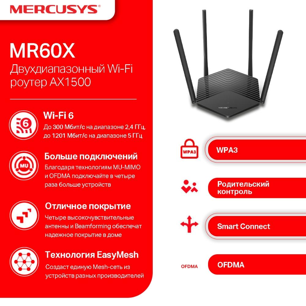 Mercusys MR60X — это двухдиапазонный роутер, работающий на стандарте Wi-Fi 6 (AX1500), который обеспечивает высокую скорость и стабильность беспроводного подключения. Этот роутер предназначен для использования в домашних условиях и малых офисах, где требуется надежное и быстрое интернет-соединение. Благодаря поддержке двух диапазонов (2.4 ГГц и 5 ГГц), Mercusys MR60X обеспечивает гибкость в подключении различных устройств, что позволяет оптимизировать использование сети в зависимости от потребностей пользователей.
