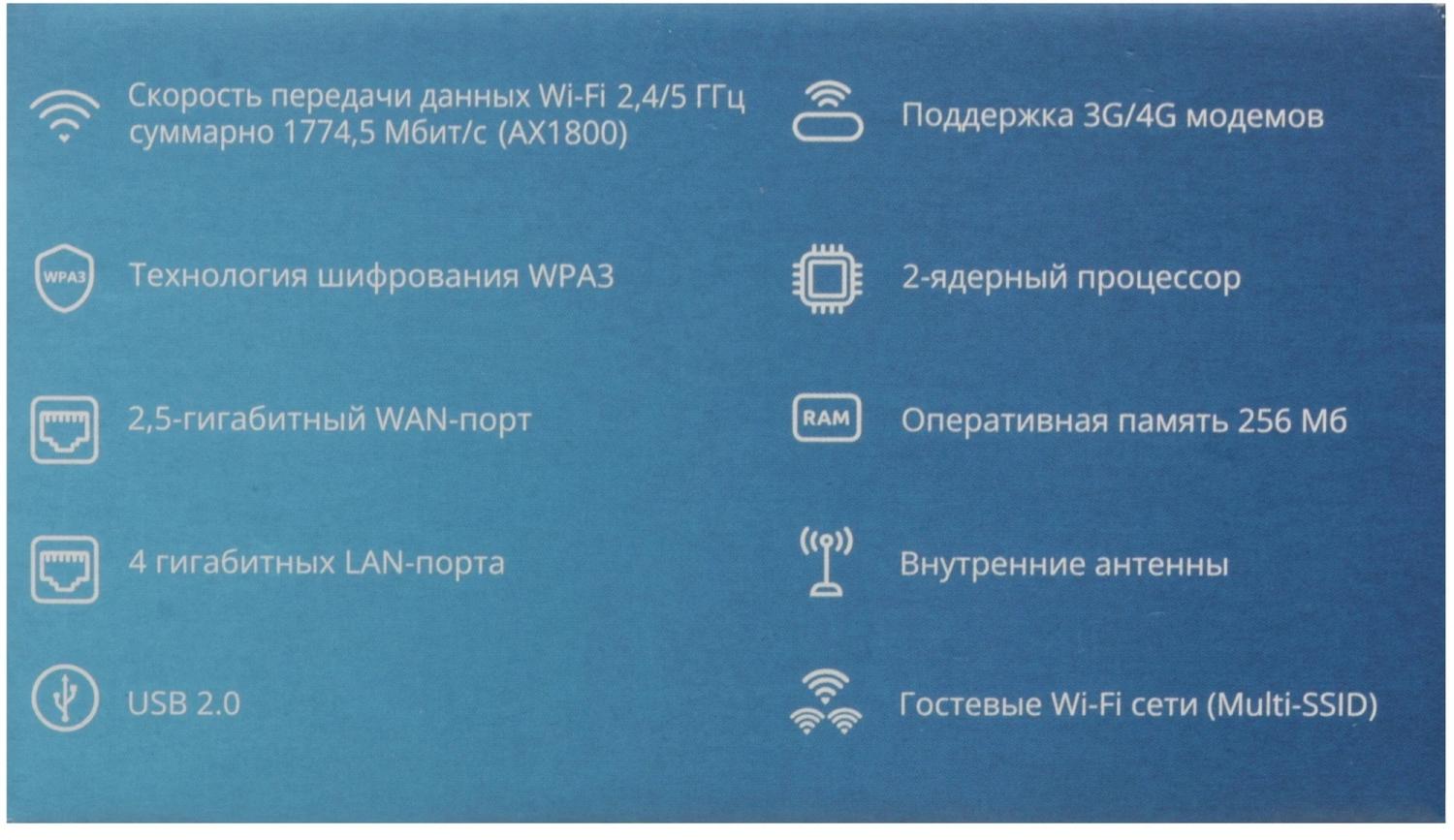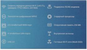 Особенности Абонентский маршрутизатор RG-1520G-Wax: 1 порт WAN 10/100/1000/2500 Base-T, 4 порта LAN 10/100/1000Base-T, 1xUSB, Wi-Fi (802.11ax, 2*2 - 573Мбит/с - 2.4ГГц + 802.11ax, 2*2 - 1201Мбит/с-5ГГц)