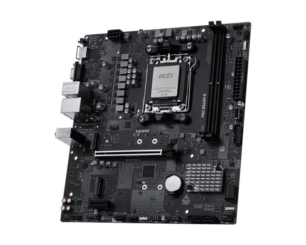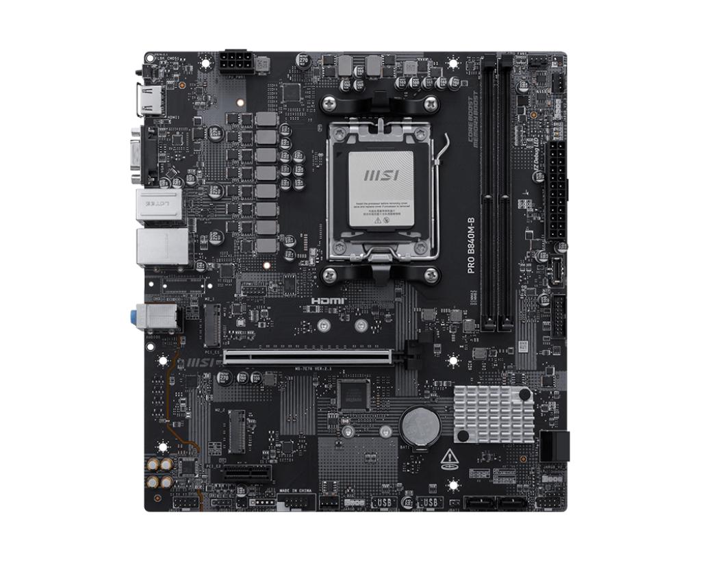 Материнская плата MSI PRO B840M-B — это удачное сочетание надежной функциональности и лаконичного современного дизайна. Эта компактная модель формата Micro-ATX выполнена в строгом черном цвете, благодаря чему легко вписывается в любой рабочий или домашний ПК.