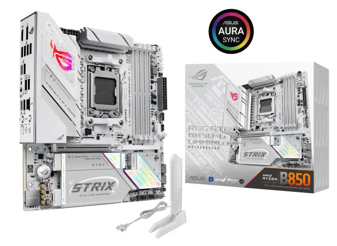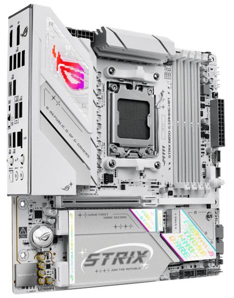 ASUS ROG Strix B850-G Gaming WiFi — стильная материнская плата с белой печатной платой, созданная для процессоров AMD Ryzen серии 7000, 8000 и 9000. Поддержка быстрой памяти DDR5 и интерфейсов PCIe 5.0 и USB Type-C 20 Гбит/с обеспечивает молниеносную скорость и стабильную работу.