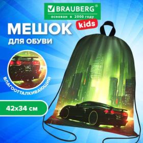 Мешок для обуви BRAUBERG KIDS - необходимый аксессуар для школы! Подходит для сменной обуви и физкультурной формы, вещей для факультативных занятий.Мешок для обуви изготовлен из плотного полиэстера с водоотталкивающей пропиткой. Яркая печать коллекционного дизайна придает ему стильный вид. Мешок стандартного размера 42х34 см имеет одно вместительное отделение. Внутри можно разместить как сменную обувь, так и физкультурную форму, вещи для факультативных занятий и другие принадлежности. Ручки-шнурки позволяют переносить мешок в руках, а удобная ручка-петелька, расположенная в верхней части, дает возможность вешать его на крючок.