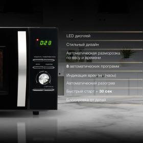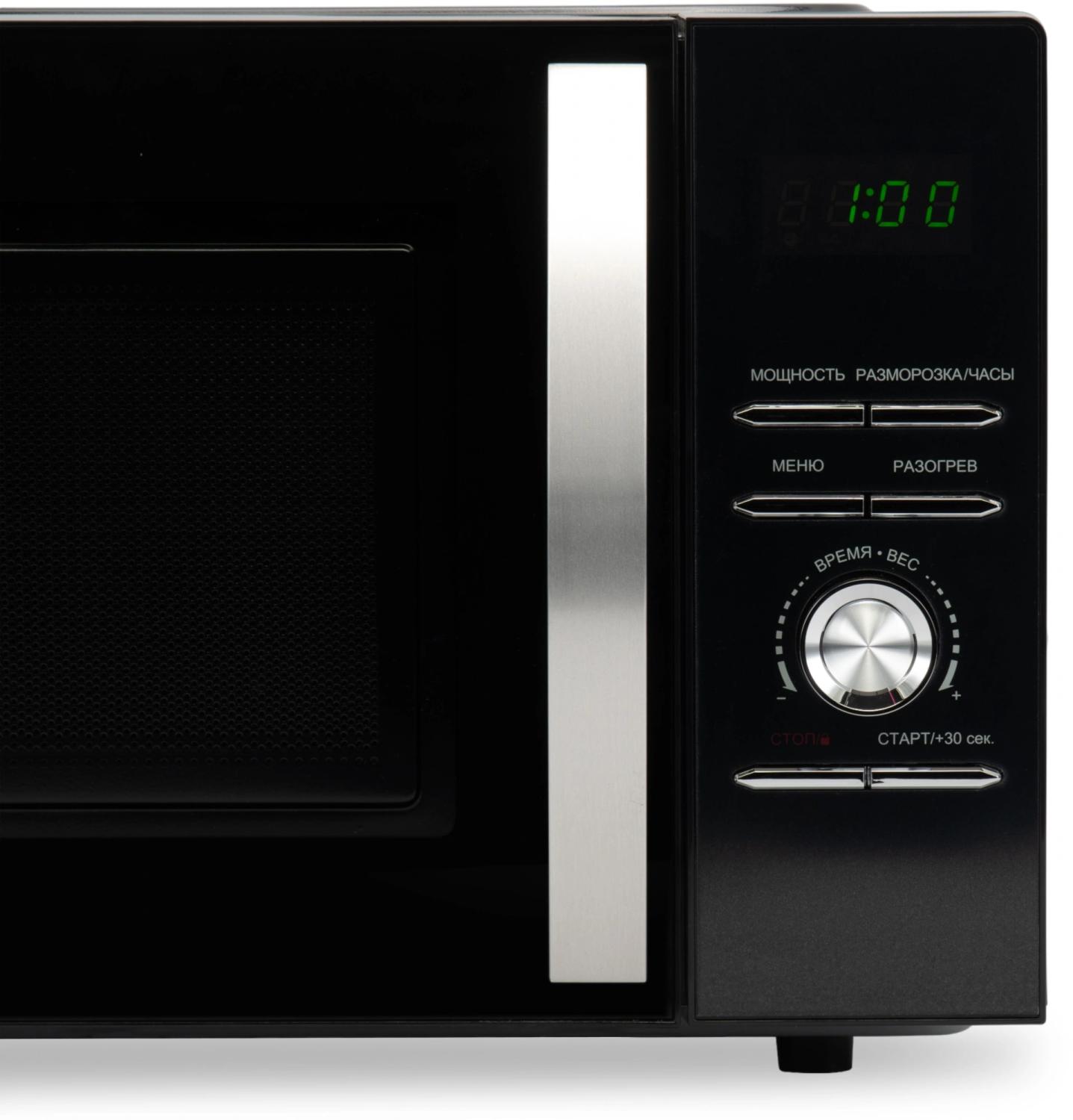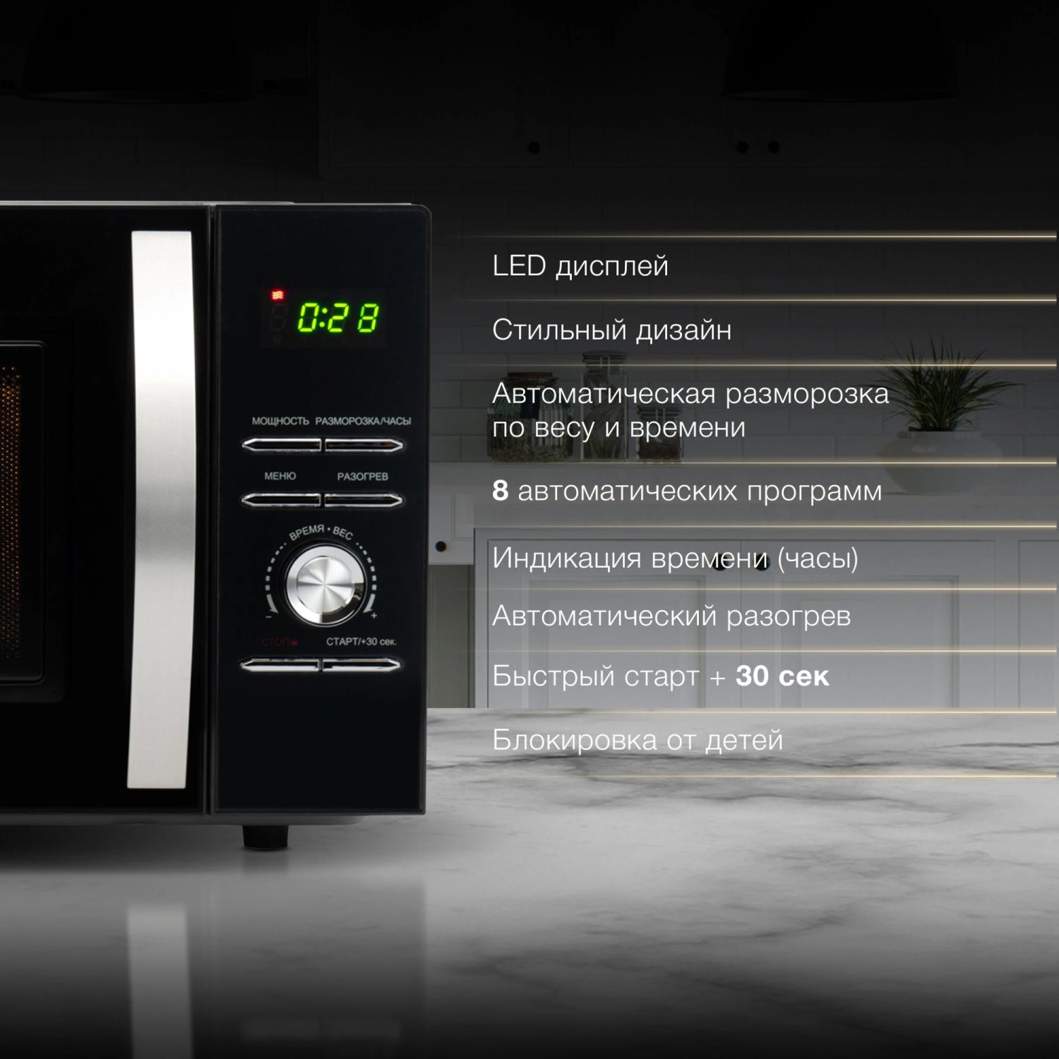 | Особенности | разморозка по весу и времени, таймер на 60 мин, автоповар, встроенные часы, дверца с полноразмерным стеклом, стильная металлическая ручка, элементы управления хром |