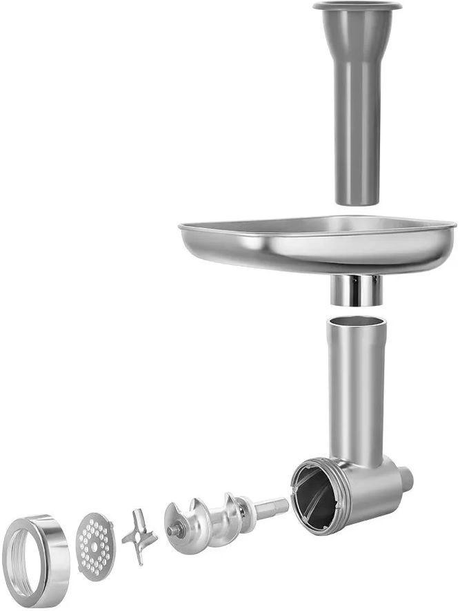 Особенности Ёмкость чаши блендера - 1,5 л Мясорубка имеет 3 решётки для изготовления фарша, специальные насадки для колбас и кеббе, 3 насадки для изготовления пасты и насадку для печенья.