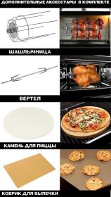 | Дополнительно в комплекте | В комплект входит – противень, решетка-гриль, вертел, шашлычница, камень для пиццы . |