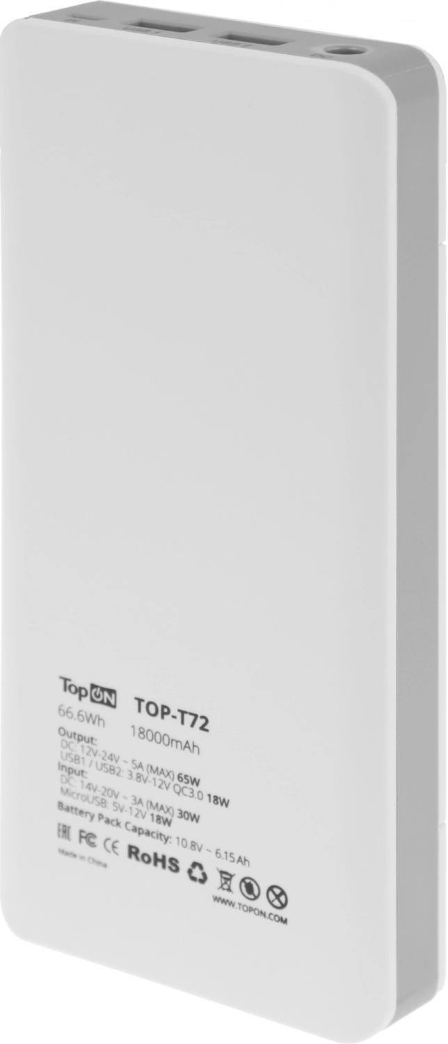 | Описание | Внешний аккумулятор TopON 18000mAh (66.6Wh) QC 2.0, 2 USB для ноутбука, планшета, смартфона и аккумулятора авто. Возможность заряжать до 3-х устройств одновременно.Совместим с большинством современных ноутбуков, планшетов и смартфонов.Диапазон выходных напряжений 12V – 24V. 10 сменных коннекторов. |