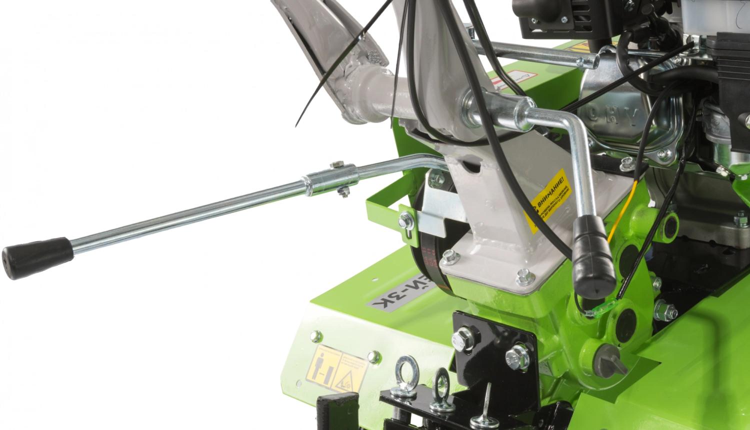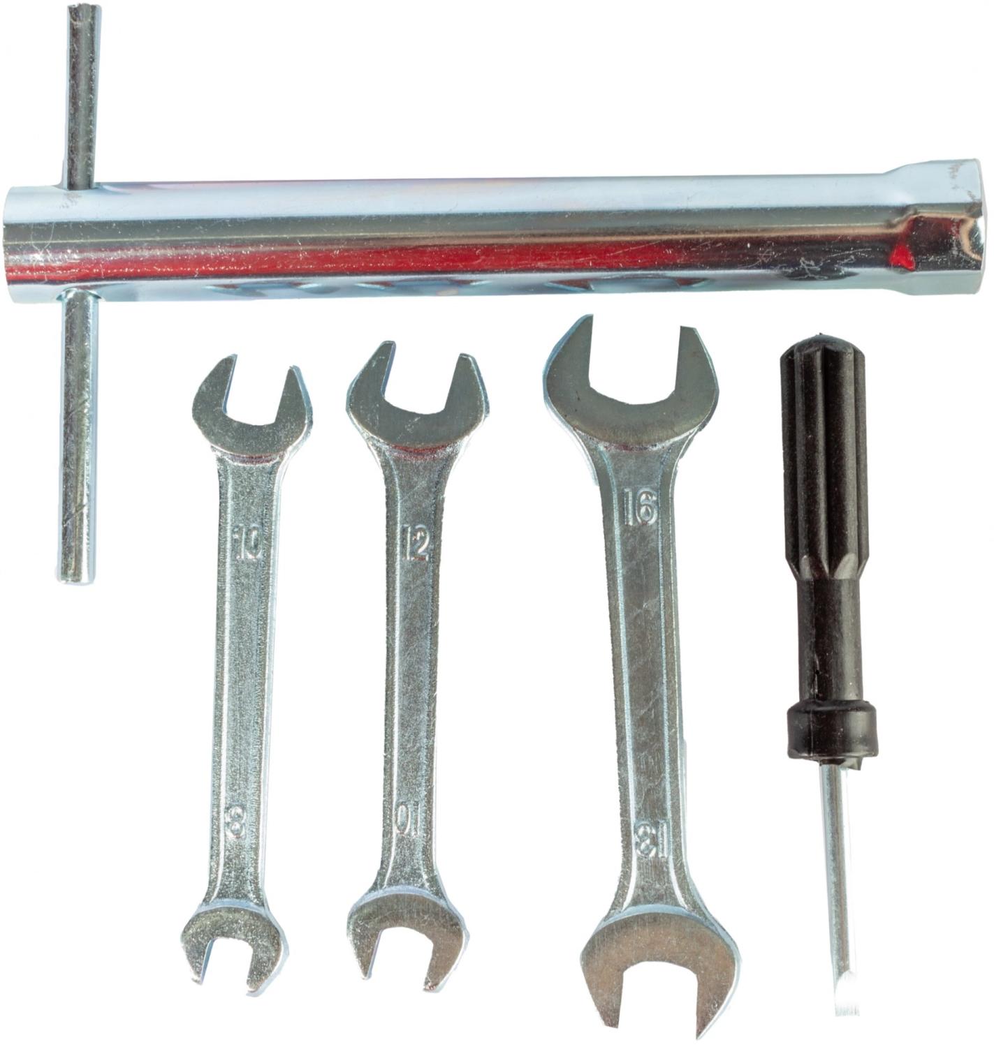 Комплект поставки Мотоблок, Фрезы (24 ножа), Полуоси для крепления фрез - 2шт, Сцепка с сошником, Крылья (щиток) - 2шт, Кронштейн передний, Кронштейн задний, Крепления 2 комплекта, Ключ гаечный - 3шт, Ключ свечной, Отвёртка, Стяжки, Инструкция по эксплуатации, 2 колеса