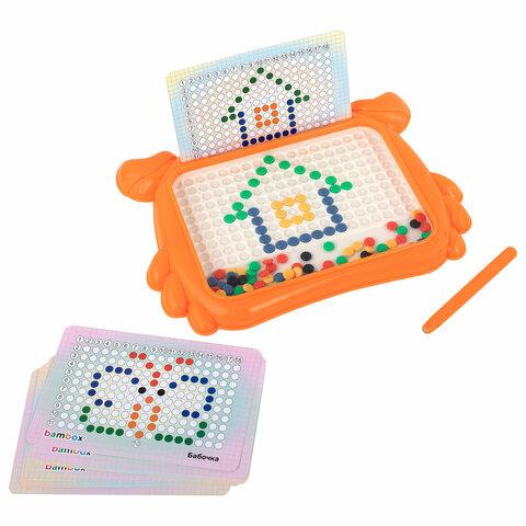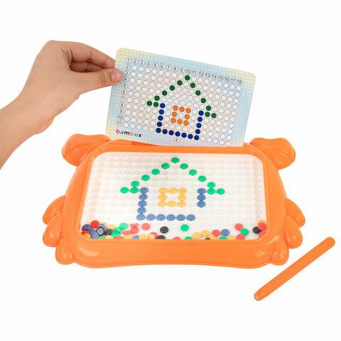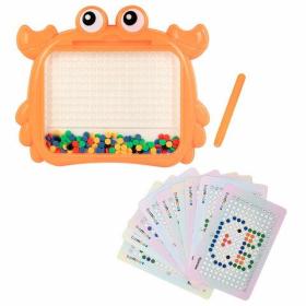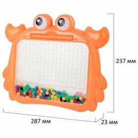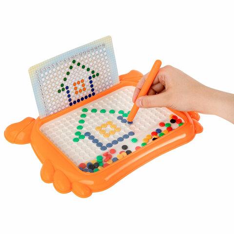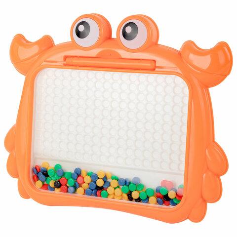 Детская развивающая магнитная игрушка в виде мозаики с разноцветными пуговками станет для ребёнка источником неограниченного креатива и хорошего настроения.В набор входит игровое поле в виде краба, изготовленное из прочного ABS пластика. Игровое поле накрыто прозрачным акриловым экраном. На игровом поле предусмотрено 180 ячеек для цветной мозаики. Под акриловым стеклом располагается цветная магнитная мозаика в количестве 101 штуки. В комплект также входит стилус из ABS-пластика с магнитным наконечником и 10 двусторонних карточек с заданиями.