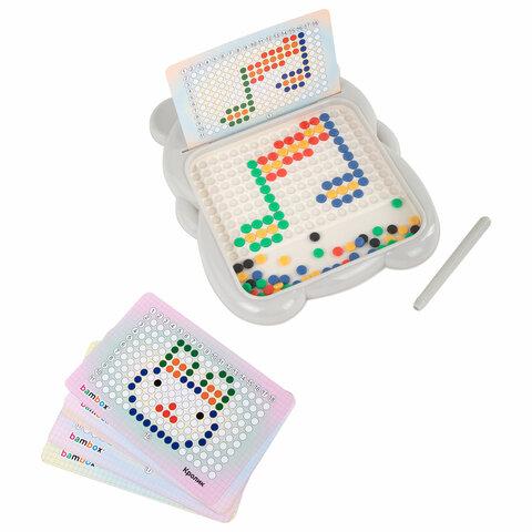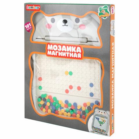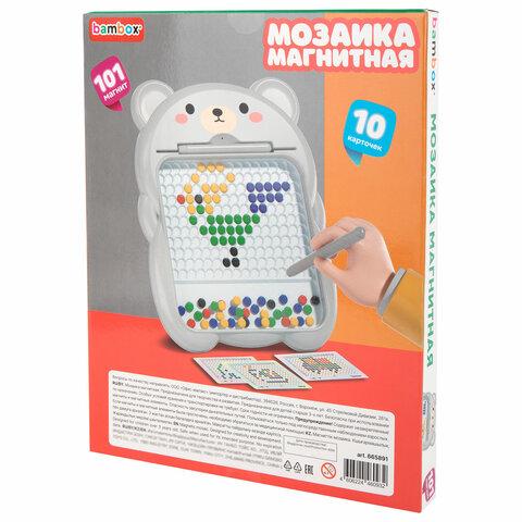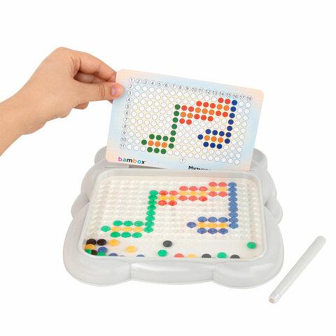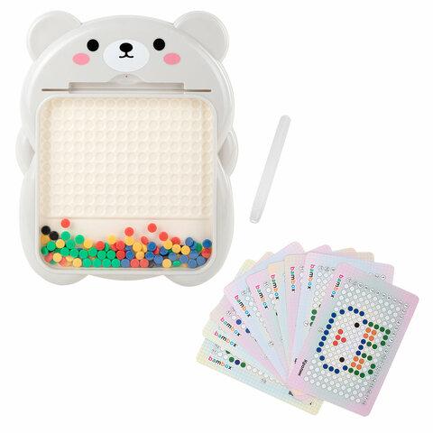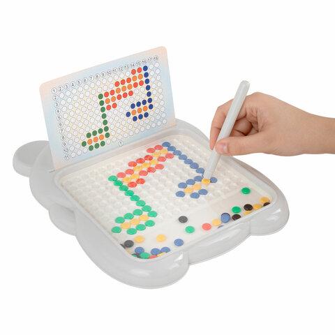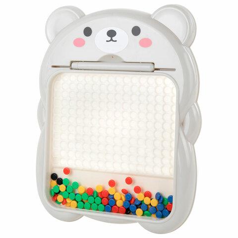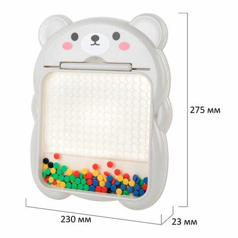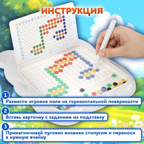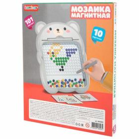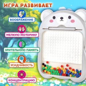 Детская развивающая магнитная игрушка в виде мозаики с разноцветными пуговками станет для ребёнка источником неограниченного креатива и хорошего настроения.В набор входит игровое поле в виде медвежонка, изготовленное из прочного ABS пластика. Игровое поле накрыто прозрачным акриловым экраном. На игровом поле предусмотрено 180 ячеек для цветной мозаики. Под акриловым стеклом располагается цветная магнитная мозаика в количестве 101 штуки. В комплект также входит стилус из ABS-пластика с магнитным наконечником и 10 двусторонних карточек с заданиями.