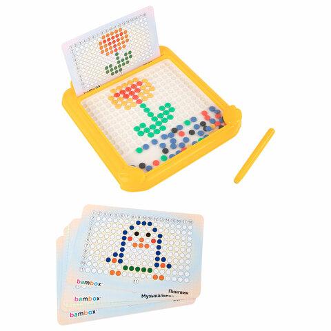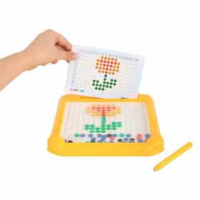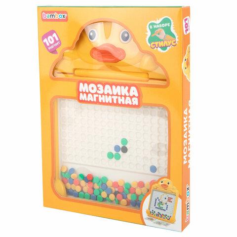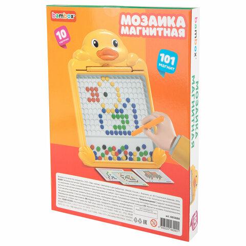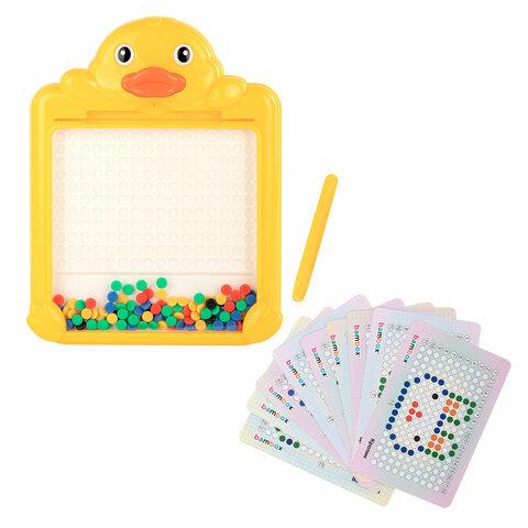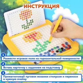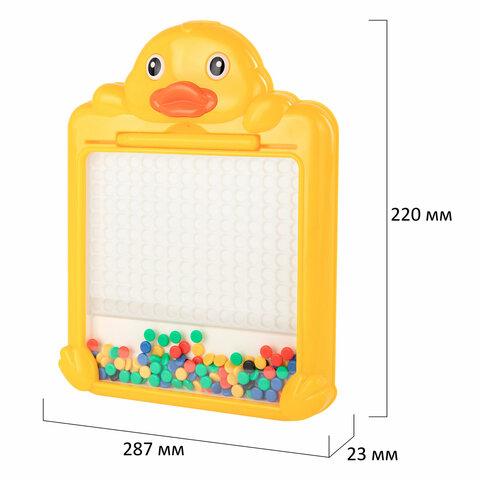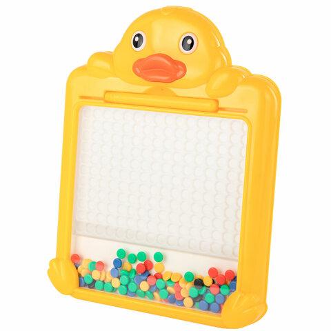 Детская развивающая магнитная игрушка в виде мозаики с разноцветными пуговками станет для ребёнка источником неограниченного креатива и хорошего настроения.В набор входит игровое поле в виде утёнка, изготовленное из прочного ABS пластика. Игровое поле накрыто прозрачным акриловым экраном. На игровом поле предусмотрено 180 ячеек для цветной мозаики. Под акриловым стеклом располагается цветная магнитная мозаика в количестве 101 штуки. В комплект также входит стилус из ABS-пластика с магнитным наконечником и 10 двусторонних карточек с заданиями.
