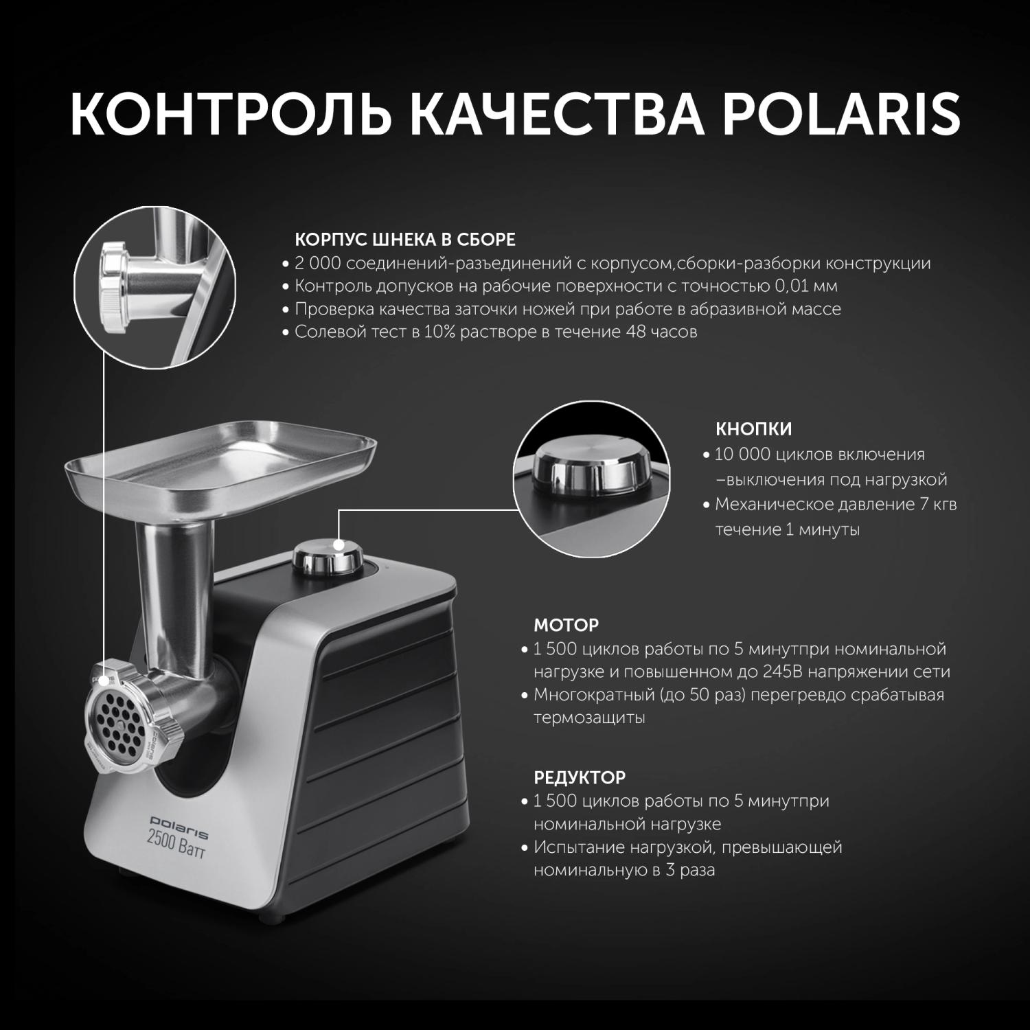 | Описание | Многофункциональная мясорубка Polaris PMG 2561 оснащена надежным мотором мощностью 2500 Вт, что обеспечивает высокую производительность прибора: до 2,7 кг мяса в минуту. Технология PROTech усиливает крутящий момент и увеличивает эффективность работы. В комплекте 2 диска из нержавеющей стали (5 и 7 м |