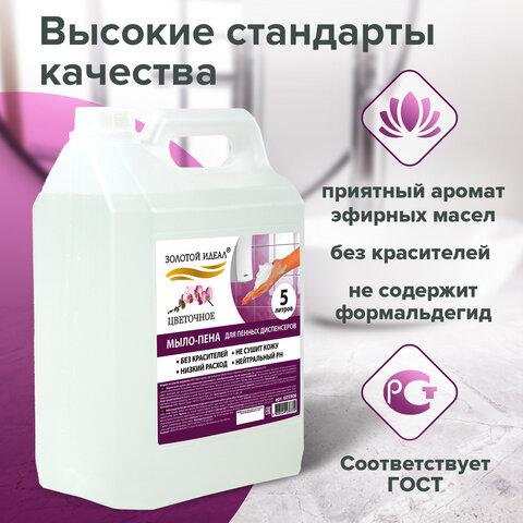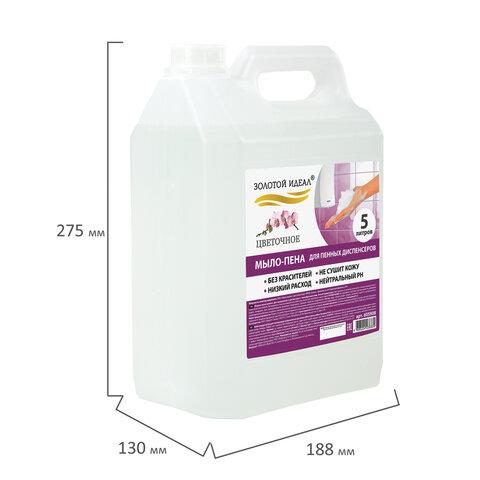 Жидкое мыло-пена ЗОЛОТОЙ ИДЕАЛ "Цветочное" идеально подходит для использования в офисах, отелях, ресторанах и других общественных местах.Средство универсального применения отлично очищает и смягчает кожу, обеспечивает уход и увлажнение, обладает приятным ароматом эфирных масел. Подходит для всех типов кожи и не содержит формальдегида. Большого объема 5 л хватит надолго, что позволит сэкономить время и средства. При необходимости можно перелить во флакон с дозатором.