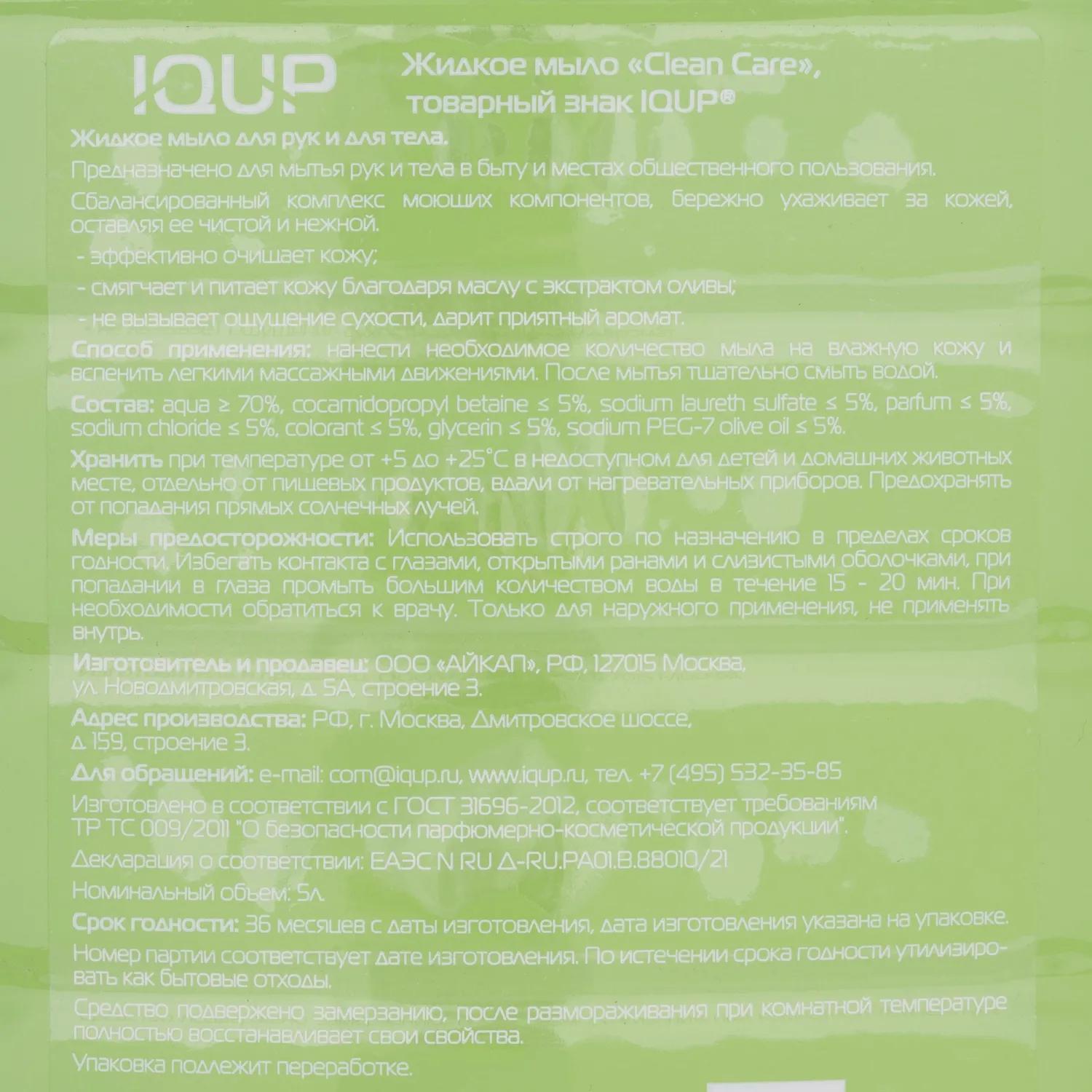 Мыло жидкое Clean Care для мытья рук в быту и местах общественного пользования после контакта с возможным источником инфекции. Отмоет загрязнения, смягчит и увлажнит загрубевшие участки кожи, восстановит естественный вид кожи после длительной работы в перчатках, нейтрализует и уберёт с рук потенциальные источники инфекции.<br>Эффективно и бережно очищает кожу.<br>Подходит для сухой кожи.<br>Область применения в быту и местах общественного пользования, на промышленных и производственных предприятиях, предприятиях пищевой промышленности, медицинских учреждениях.<br>Способ применения: нанести необходимое количество мыла на влажную кожу рук, распределить по всей промываемой поверхности рук и вспенить лёгкими массажными движениями. После мытья тщательно смыть водой, не применять на открытые раны и слизистые оболочки.<br>Меры предосторожности. Использовать строго по назначению в пределах срока годности. Избегать контакта с глазами, открытыми ранами и слизистыми оболочками, при попадании в глаза промыть большим количеством воды в течение 15-20 мин. При необходимости обратиться к врачу. Только для наружного применения, не применять внутрь<br>Хранить при температуре от +5 до +25C в недоступном для детей и домашних животных месте, отдельно от пищевых продуктов, вдали от нагревательных приборов. Предохранять от попадания прямых солнечных лучей.<br>Срок годности: 36 месяцев с даты изготовления.<br>По истечении срока годности утилизировать как бытовые отходы.<br><br><br>Средство подвержено замерзанию, после размораживания при комнатной температуре полностью восстанавливает свои свойства, после размораживания содержимое флакона необходимо перемешать. Упаковка подлежит переработке, тип материала указан на дне флакона.