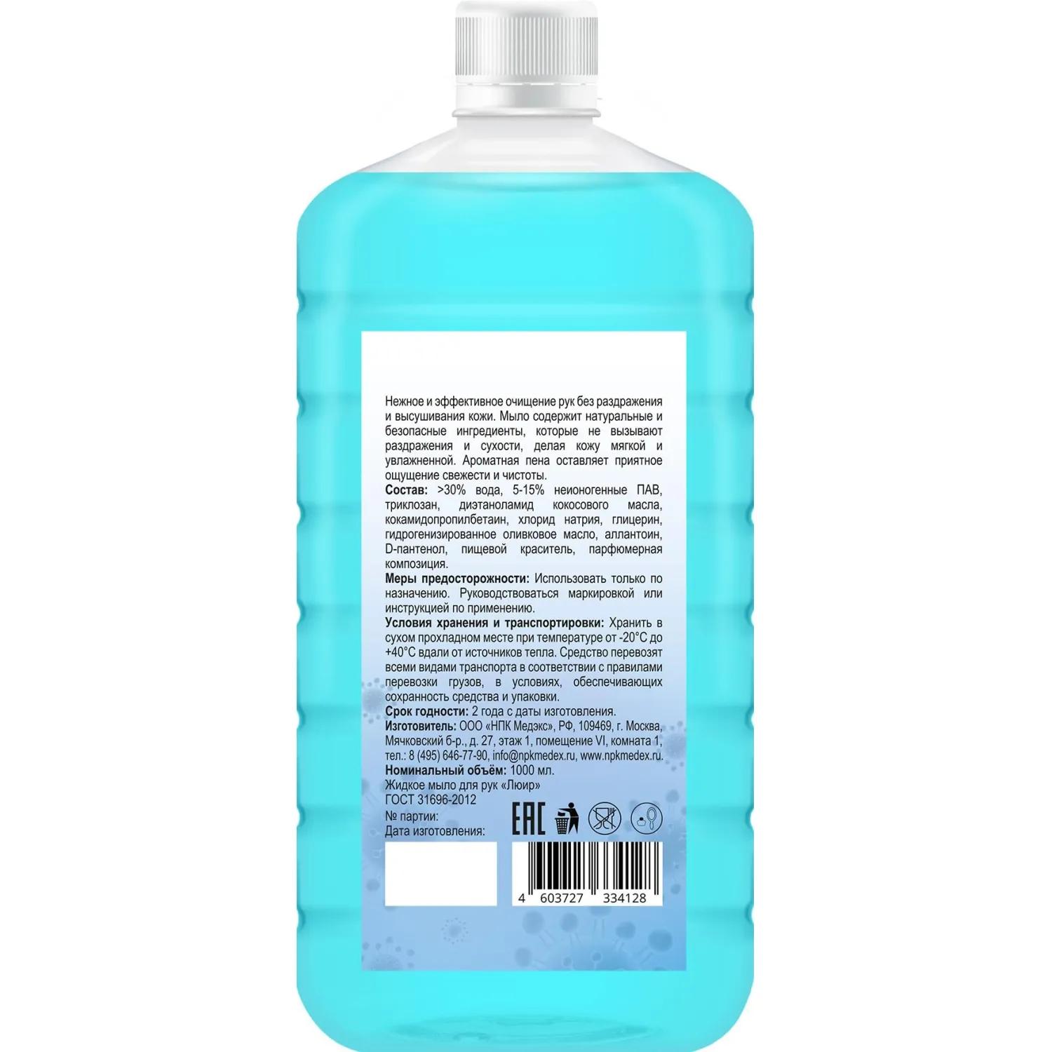 Мыло жидкое Люир объёмом 1000 мл предназначено для гигиенической обработки рук медицинского персонала (в том числе оперирующего персонала в лечебно-профилактических учреждениях (далее ЛПУ) перед использованием кожного антисептика) и санитарной обработки кожных покровов пациентов в ЛПУ, детских дошкольных и школьных учреждений, санаториев, домов отдыха, пансионатов, учреждений соцобеспечения, предприятий коммунально-бытового обслуживания, предприятий пищевой промышленности, общественного питания, транспорта, а также населения в быту.<br><br>Обладает бактерицидной (золотистый стафилококк, кишечная палочка) и фунгицидной (грибы рода Кандида, Aspergillins niger) активностью, исследовано в соответствии с требованиями санитарно-эпидемиологического законодательства.<br><br>Состав: в качестве действующего вещества триклозан, а также функциональные добавки, увлажняющие и ухаживающие за кожей компоненты.<br><br>Меры предосторожности: использовать только для наружного применения. Избегать попадания в глаза. Не использовать по истечении срока годности. При случайном попадании в глаза их следует обильно промыть чистой проточной водой. При случайном попадании в желудок рекомендуется промыть его водой комнатной температуры. Затем выпить несколько стаканов воды с добавлением абсорбента (10–15 таблеток активированного угля).<br><br>Условия хранения: хранить средство в сухих складских помещениях отдельно от пищевых продуктов и лекарственных средств, в местах недоступных детям, при температуре 0°C до +35°C.<br><br>Срок годности: 24 месяца.<br><br>Страна происхождения: Россия.