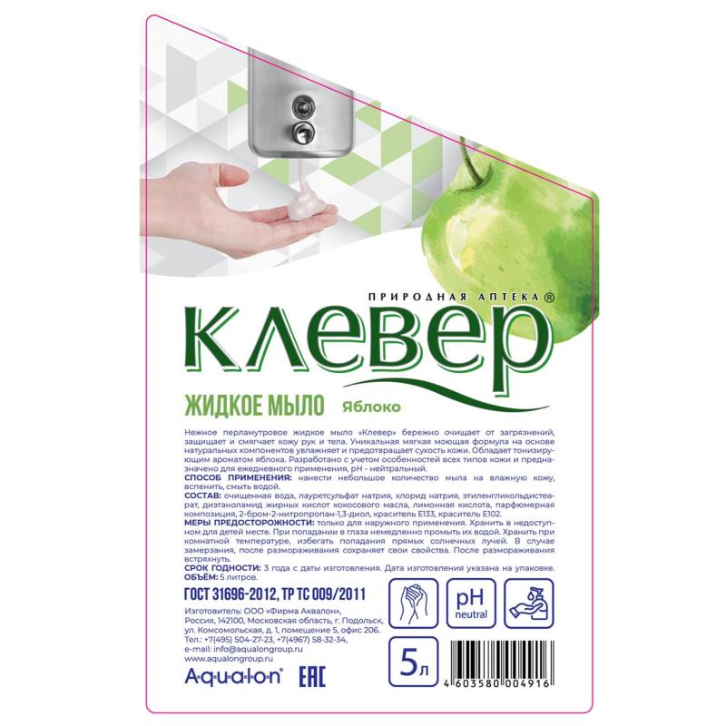Мыло жидкое Aqualon Клевер Яблоко 5000 мл<br><br>Назначение: нежное перламутровое жидкое мыло Клевер бережно очищает от загрязнений, защищает и смягчает кожу рук и тела. Уникальная мягкая моющая формула на основе натуральных компонентов увлажняет и предотвращает сухость кожи. Обладает тонизирующим ароматом яблока. Разработано с учётом особенностей всех типов кожи и предназначено для ежедневного применения. pH-нейтрально.<br>Меры предосторожности: хранить в недоступном для детей месте. При попадании в глаза промыть большим количеством воды. Только для наружного применения.<br>Состав: очищенная вода, лауретсульфат натрия, хлорид натрия, этиленгликольдистеарат, диэтаноламид жирных кислот кокосового масла, лимонная кислота, парфюмерная композиция, 2-бром-2-нитропропан-1.3-диол, краситель Е133, краситель Е102.<br>Условия хранения: хранить при комнатной температуре, избегать попадания прямых солнечных лучей. В случае замерзания после размораживания сохраняет свои свойства. После размораживания встряхнуть.<br>Срок годности: 3 года с даты изготовления.