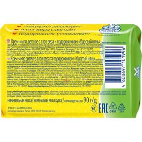 Мыло туалетное детское Ушастый нянь. Гель алоэ вера — обладает антиоксидантными и бактерицидными свойствами. Алоэ является издревле известным средством народной медицины. Используется с целью быстрого заживления небольших кожных повреждений.<br>Глицерин — сильный увлажнитель, защищает кожу от потери естественной влаги, обеспечивает смягчение и увлажнение кожи человека, ввиду своей способности притягивать и удерживать влагу.<br>Экстракт подорожника — обладает противовоспалительными и ранозаживляющими свойствами.<br>Действие:<br>— нежно очищает, увлажняет и смягчает;<br>— активные компоненты питают кожу и снижают вероятность появления аллергических реакций;<br>— содержит специальные ухаживающие компоненты, благодаря которым достигается эффект крема в мыле.