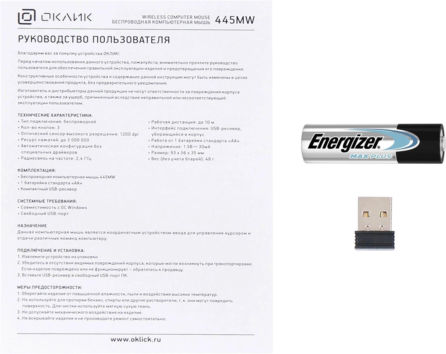 | Комплектация | Беспроводная оптическая мышь 445MW 1 батарейка стандарта «AA» USB-ресивер |