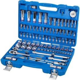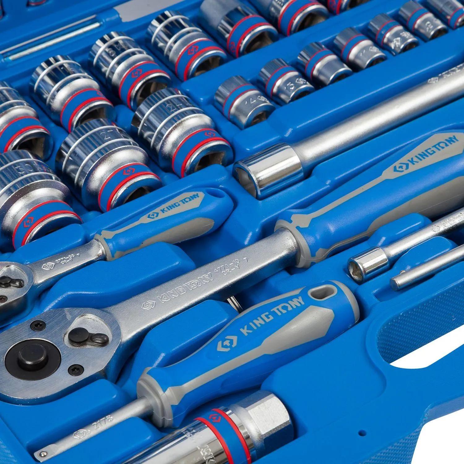 King Tony 7596MR — это набор инструментов состоящий из 96 предметов. Головки и принадлежности 2-х форматов присоединительного квадрата: 1/2″ и 1/4″. Широкий ряд торцевых насадок 1/4″ и вставок 5/16″. Глубокие торцевые головки форматов 1/2″ и 1/4″. Удлинитель 4222-10 + переходник 3824 — в сочетании эти два инструмента образуют многофункциональный Т-образный вороток для силовых работ с крепежом. Набор изготовлен из высокопрочной легированной хром-ванадиевой инструментальной стали, а хромированное покрытие защищает инструмент от коррозии. Для придания торцевым головкам особой прочности, в процессе изготовления применён метод ковки, что повышает прочность, а соответственно и надёжность инструментов.&quot; на «King Tony 7510MR — это новинка торговой марки King Tony в линейке универсальных наборов. Отличная комплектация набора делает его незаменимым помощником практически для любого применения. Головки и принадлежности 2-х форматов присоединительного квадрата: 1/2» и 1/4″. Кейс из пластика марки ABS: прочный, стойкий к воздействию агрессивных жидкостей, не теряет физических свойств при низких или высоких температурах окружающей среды. Набор изготовлен из высокопрочной легированной хром-ванадиевой инструментальной стали, а хромированное покрытие защищает инструмент от коррозии.<br><br>Комплектация<br>Головки и принадлежности 1/2″<br>— Головка торцевая стандартная 6-гранная: 10, 11, 12, 13, 14, 15, 16, 17, 18, 19, 20, 21, 22, 24, 27, 30, 32 мм;<br>— Головка торцевая глубокая 6-гранная: 14, 15, 17, 19, 22 мм;<br>— Головка свечная 6-гранная, резиновый фиксатор: 16, 21 мм;<br>— Трещотка флажковая с кнопкой 250 мм;<br>— Удлинитель 125 мм;<br>— Удлинитель-вороток 250 мм;<br>— Переходник 3/8″ на 1/2″;<br>— Кардан;<br>— Держатель вставок (бит) 5/16″;<br>Головки и принадлежности 1/4″<br>— Головка торцевая стандартная 6-гранная: 4, 4.5, 5, 5.5, 6, 7, 8, 9, 10, 11, 12, 13, 14 мм;<br>— Головка торцевая глубокая 6-гранная: 6, 7, 8, 9, 10, 11, 12, 13 мм;<br>— Трещотка флажковая с кнопкой 140 мм;<br>— Вороток скользящий Т-образный 115 мм;<br>— Трещотка бесшаговая, дисковый механизм, для вставок (бит);<br>— Удлинитель 50, 100 мм;<br>— Кардан;<br>— Отвёртка вороток 150 мм;<br>— Переходник для головок 25 мм;<br>Вставки (биты) 1/4″<br>— Крестовые Phillips: PH1, PH2;<br>— Крестовые Pozidriv: PZ1, PZ2;<br>— Шлицевые Slotted: 4, 5.5, 6.5 мм;<br>— Шестигранники HEX: H3, H4, H5, H6;<br>— 6-лучевая звезда TORX: T8, T10, T15, T20, T25, T27, T30;<br>Вставки (биты) 5/16″<br>— Крестовые Phillips: PH3, PH4;<br>— Крестовые Pozidriv: PZ3, PZ4;<br>— Шлицевые Slotted: 8×1.2, 10×1.6, 12×2.0 мм;<br>— Шестигранники HEX: H7, H8, H10, H12, H14;<br>— 6-лучевая звезда TORX: T40, T45, T50, T55;<br>Вспомогательный инструмент<br>— Шестигранники: 1.5, 2, 2.5.<br><br>Внешний вид и/или характеристики товара могут быть изменены производителем в соответствии с производственным процессом.