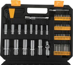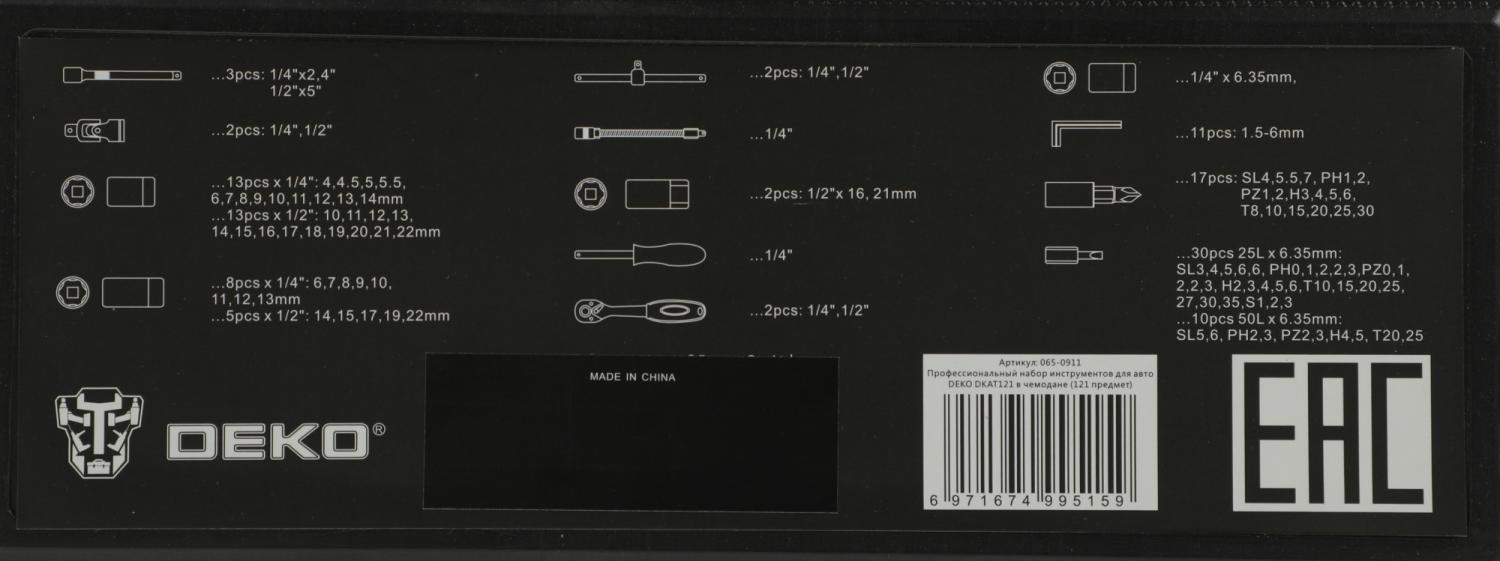| Дополнительно в наборе, 1/4"DR | Удлинители 125, 50 мм, гибкий 150 мм Адаптер, вороток Т-образный, карданный шарнир, ключ трещоточный, отверточная рукоятка |