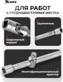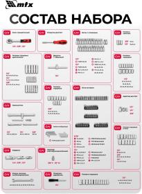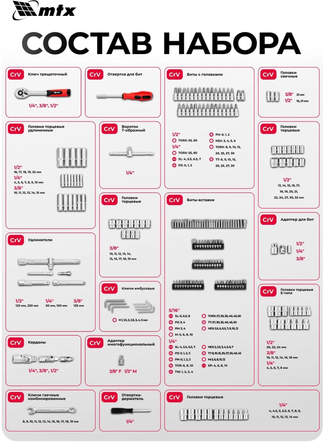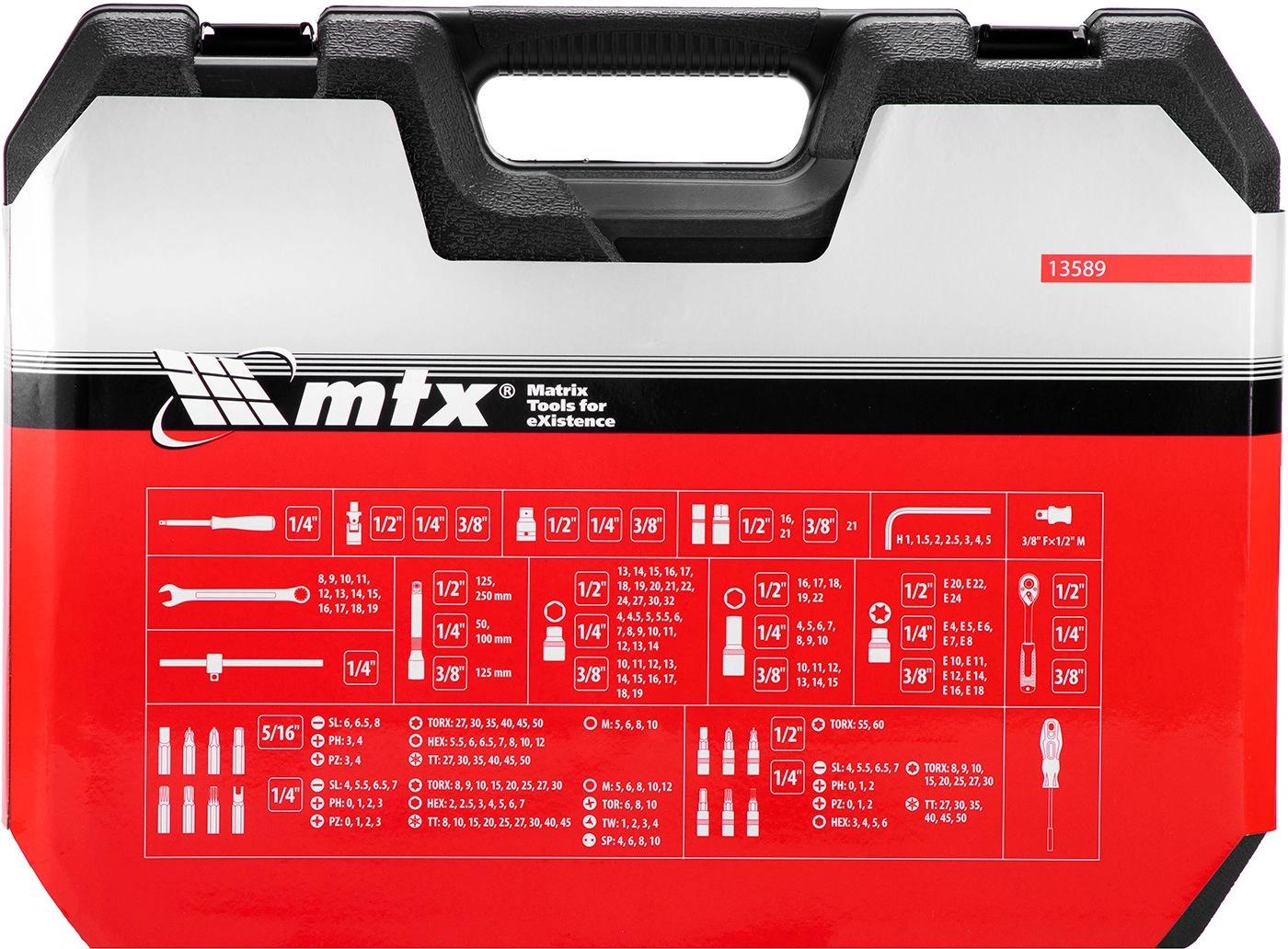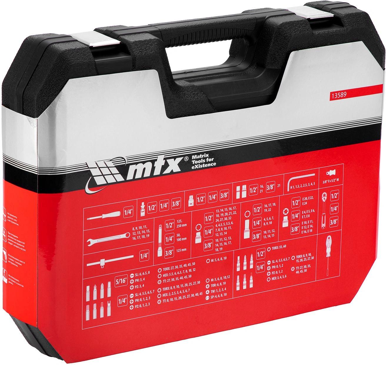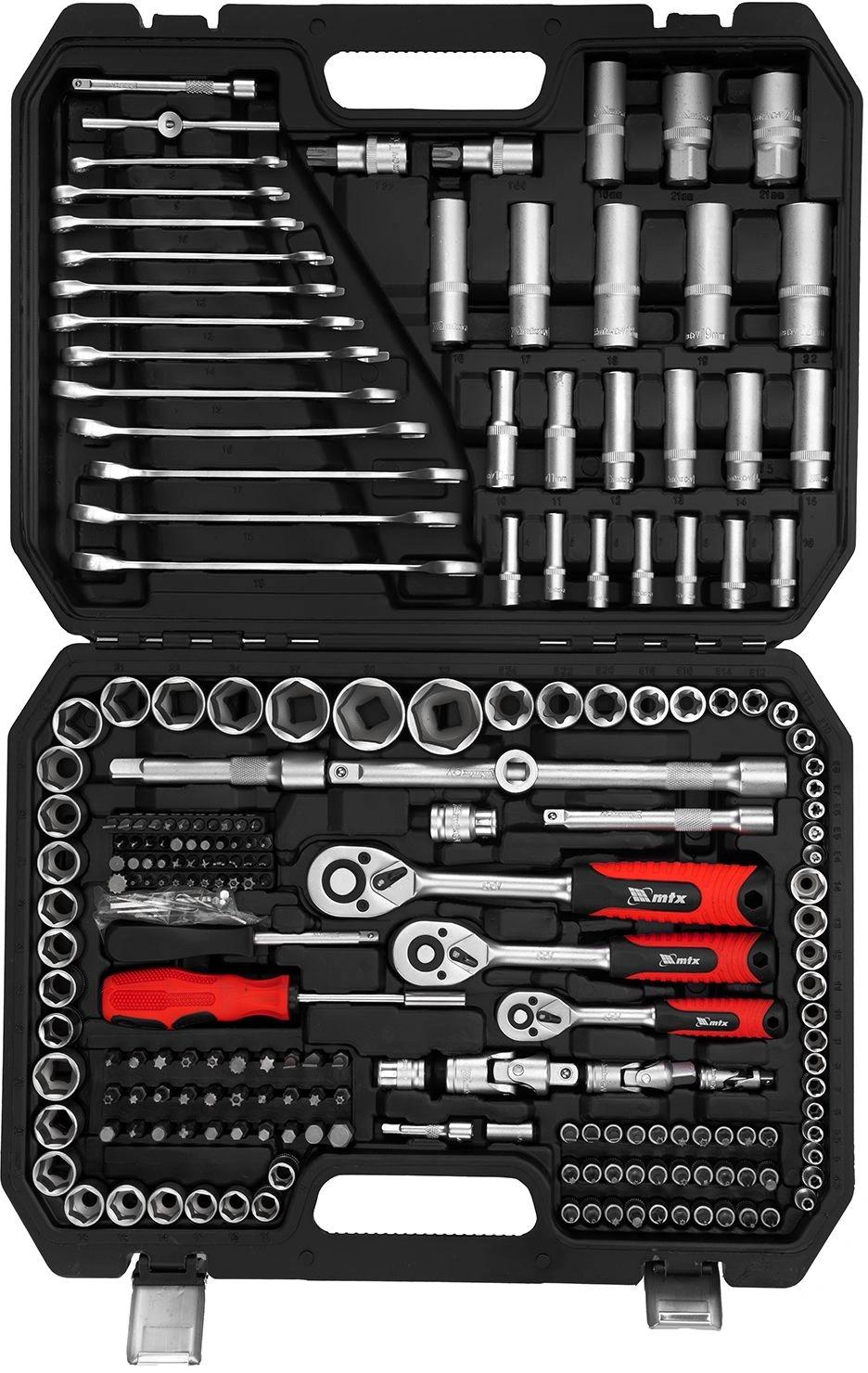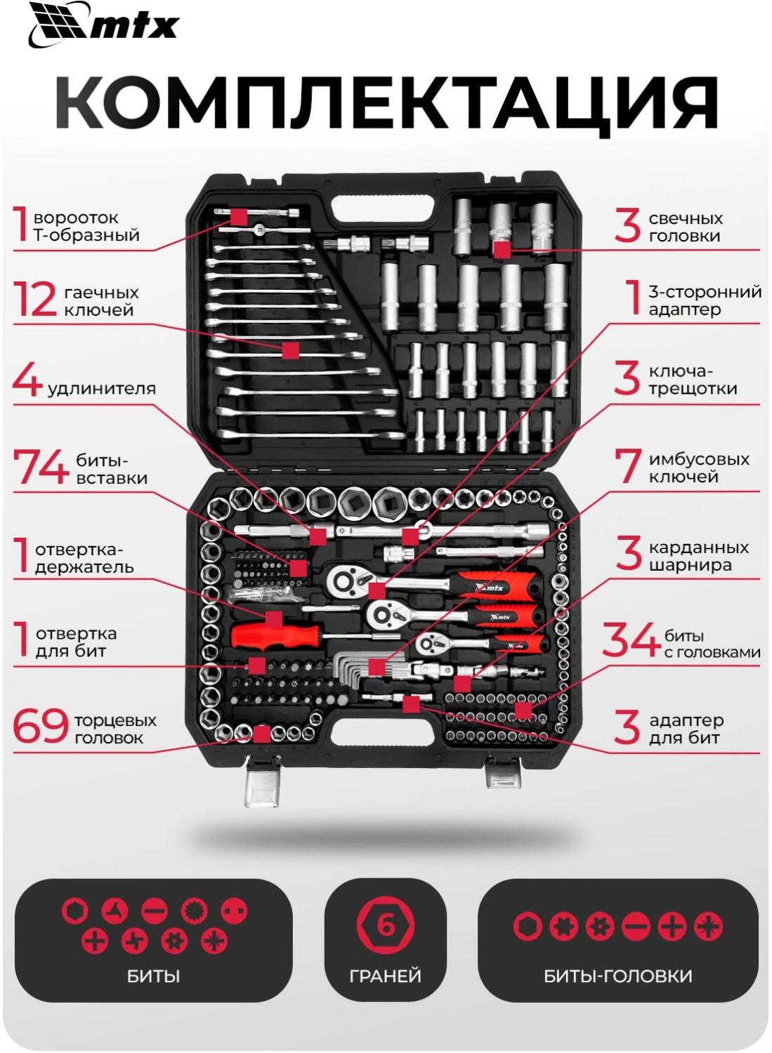 | Описание | Набор инструментов MTX 13589 упакован в пластиковый кейс и состоит из 215 предметов с присоединительным размером 1/2", 3/8", 1/4", предназначенных для монтажа и демонтажа резьбового крепежа с разными типами шлицев. |