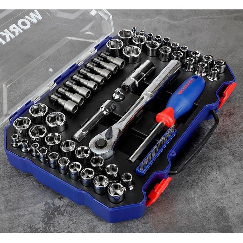Набор инструментов универсальный Workpro 63 предмета (WP202566) предоставляет отличный выбор ручных инструментов для профессионального авторемонта. Высокое качество и надежность инструментов из хром-ванадиевой стали гарантируют их износостойкость и долгий срок службы.Состав набора инструментов:- 10 шт. торцевые головки 1/4", 6-гранные: 5/32", 3/16", 7/32", 1/4", 9/32", 5/16", 11/32", 3/8", 7/16", 1/2"- 10 шт. торцевые головки 1/4", 6-гранные: 5, 5.5, 6, 7, 8, 9, 10, 11, 12, 13мм- 10 шт. торцевые головки 3/8", 6-гранные: 1/4", 5/16", 3/8", 7/16", 1/2", 9/16", 5/8", 11/16", 3/4", 13/16"- 10 шт. торцевые головки 3/8", 6-гранные: 8, 10, 11, 12, 13, 14, 15, 16, 17, 18 мм- 8 шт. магнитные головки- 1 шт. свечные головки 3/8" CR-V 16 мм- 1 шт. удлинитель 3/8" 7,5 см- 1 шт. магнитный держатель- 10 шт. биты- 1 шт. трещотка 3/8" 45T (зубьев)- 1 шт. адаптер: 3/8"x1/4"Внешний вид и/или характеристики товара могут быть изменены производителем в соответствии с производственным процессом.