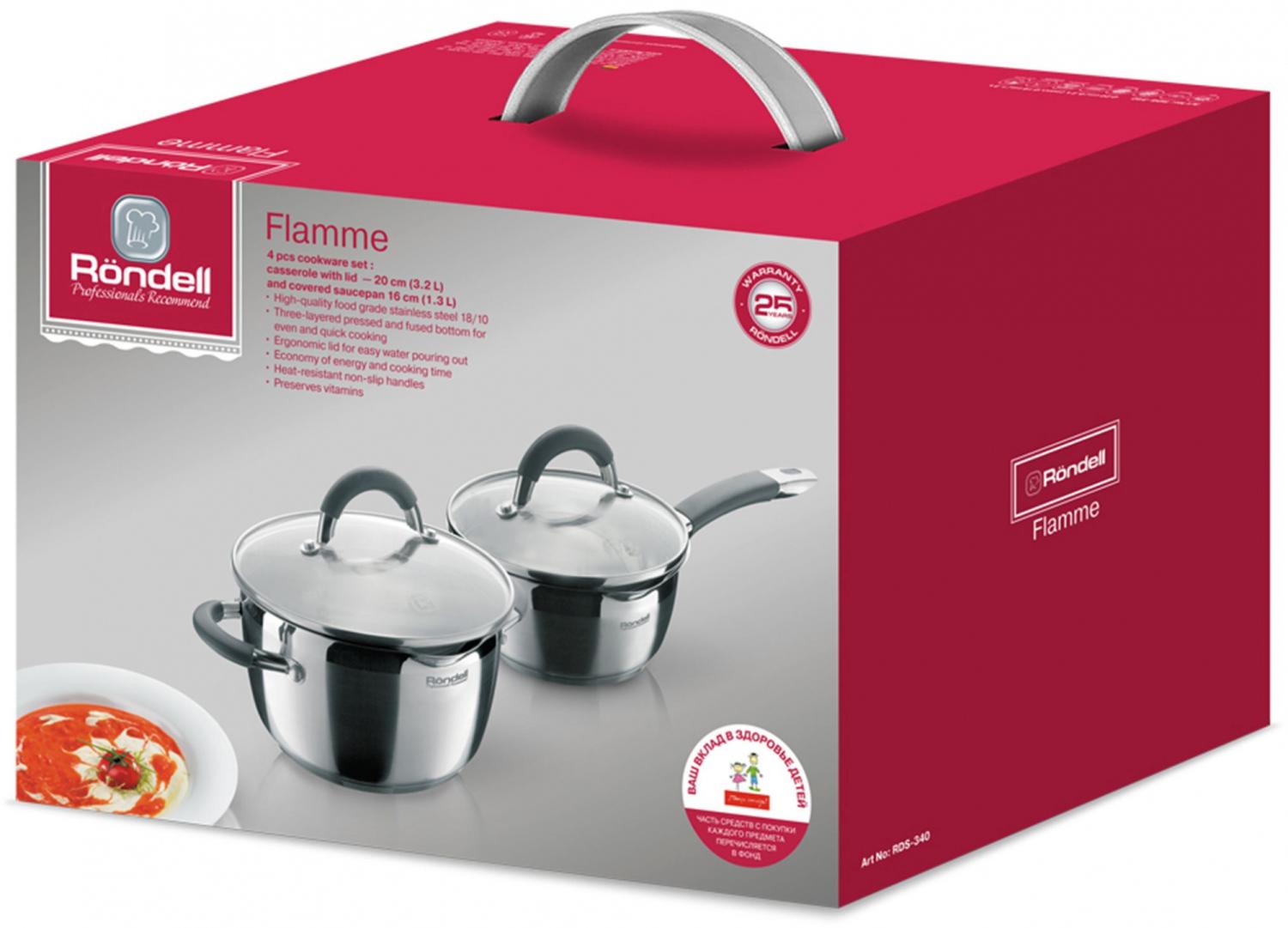 | Состав комплекта | Кастрюля 20 см (3,2 л), крышка 20 см, кастрюля 16 см (1,3 л), крышка 16 см. |