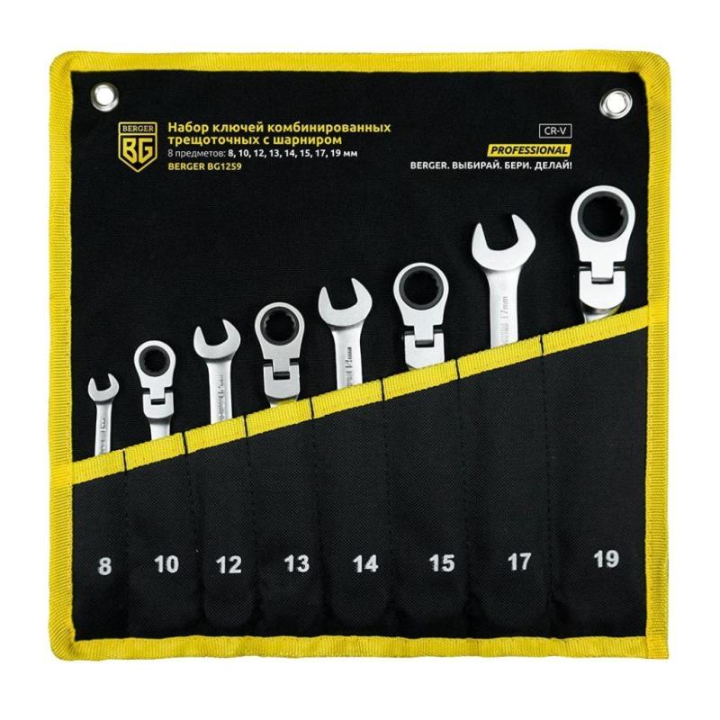 Набор ключей комбинированных трещоточных с шарниром (8 предметов) в матерчатом чехле 8, 10, 12, 13, 14, 15, 17, 19 мм. Материал: ключ полностью выполнен из прочной и качественной хром-ванадиевой стали с антикоррозийным покрытием "Сатин". Шарнир позволяет повысить функциональность ключа при работе в труднодоступных местах.Внешний вид и/или характеристики товара могут быть изменены производителем в соответствии с производственным процессом.