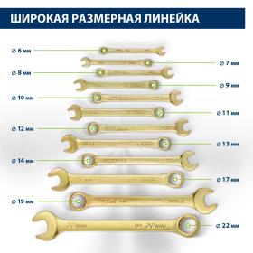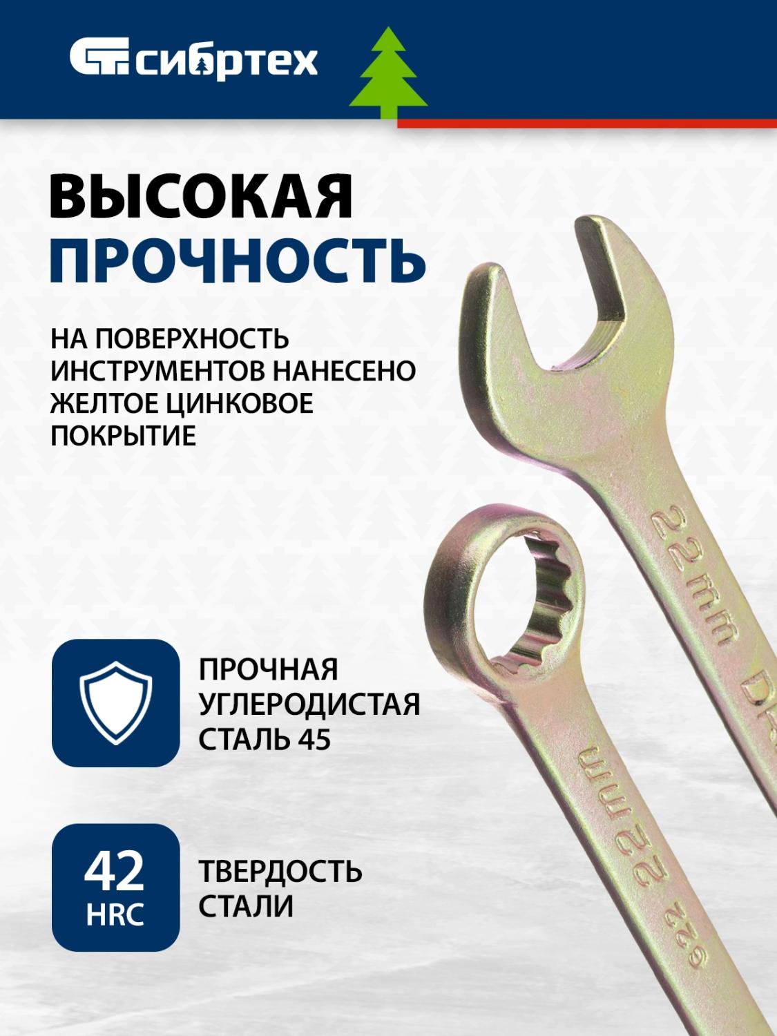 Описание Набор комбинированных ключей Сибртех 15439 состоит из 12 инструментов, покрытых желтым цинком, и предназначен для слесарно-монтажных работ с резьбовыми соединениями размером от 6 до 22 мм. Наличие рожкового и кольцевого зева делает каждый ключ универсальным в применении.