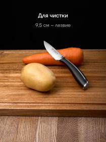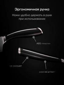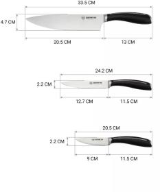 | Состав комплекта | поварской нож - лезвие 20 см., нож кухонный универсальный – лезвие 12,5 см, овощной нож для чистки и нарезки овощей и фруктов – лезвие 9 см |