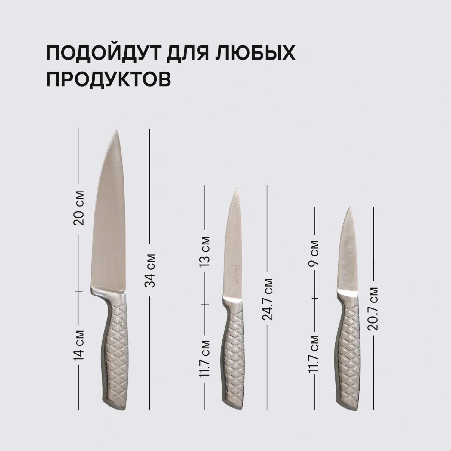 | Состав комплекта | нож поварской 20 см, нож универсальный 13 см, нож для овощей 9 см |