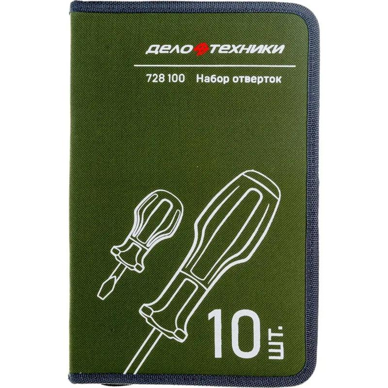 Набор отвёрток Дело Техники 728100 (10 штук). Стержни изготовлены из стали марки S2 прочной и твердой. Есть хромированное покрытие — для защиты от коррозии. Трехкомпонентная рукоятка не скользит в руке. Набор расположен в планшете из материала тетрон, удобном для хранения и переноски инструмента. Сталь: S2 Твердость: 57 — 61 HRC.<br><br> Комплектация:<br> — шлиц: 3×75 мм, 5×100 мм, 6.5×38 мм, 6.5×150 мм, 8×150 мм;<br> — РН0×75 мм, PH1×100 мм, РН2×38 мм, PH2×100 мм, РН3×150 мм;<br> — планшет из материала тетрон.<br><br><!--noindex-->Внешний вид и/или характеристики товара могут быть изменены производителем в соответствии с производственным процессом.<!--/noindex-->