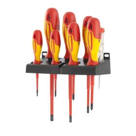 Описание Набор отверток диэлектрических до 1000 В, тестер, CrMo, двухкомпонентные рукоятки, 8 предм.