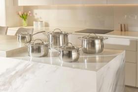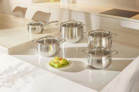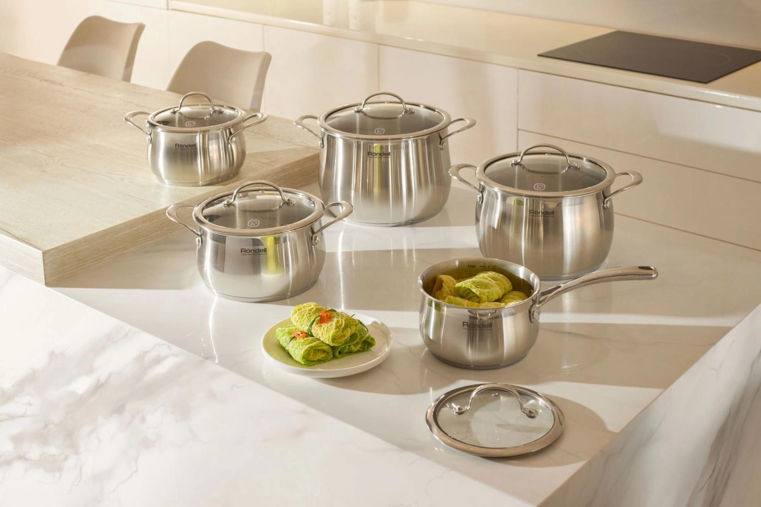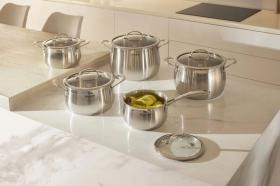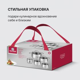| Особенности | Материал: высококачественная нержавеющая сталь 18/0. Толщина стенок: 0,5 мм. Толщина дна: 5,0 мм. Аксессуары: литые, из нержавеющей стали. Преимущества: эргономичная форма ручек; равномерный прогрев изделия; округлая форма корпуса; высокие стенки корпуса – большой литраж посуды. |