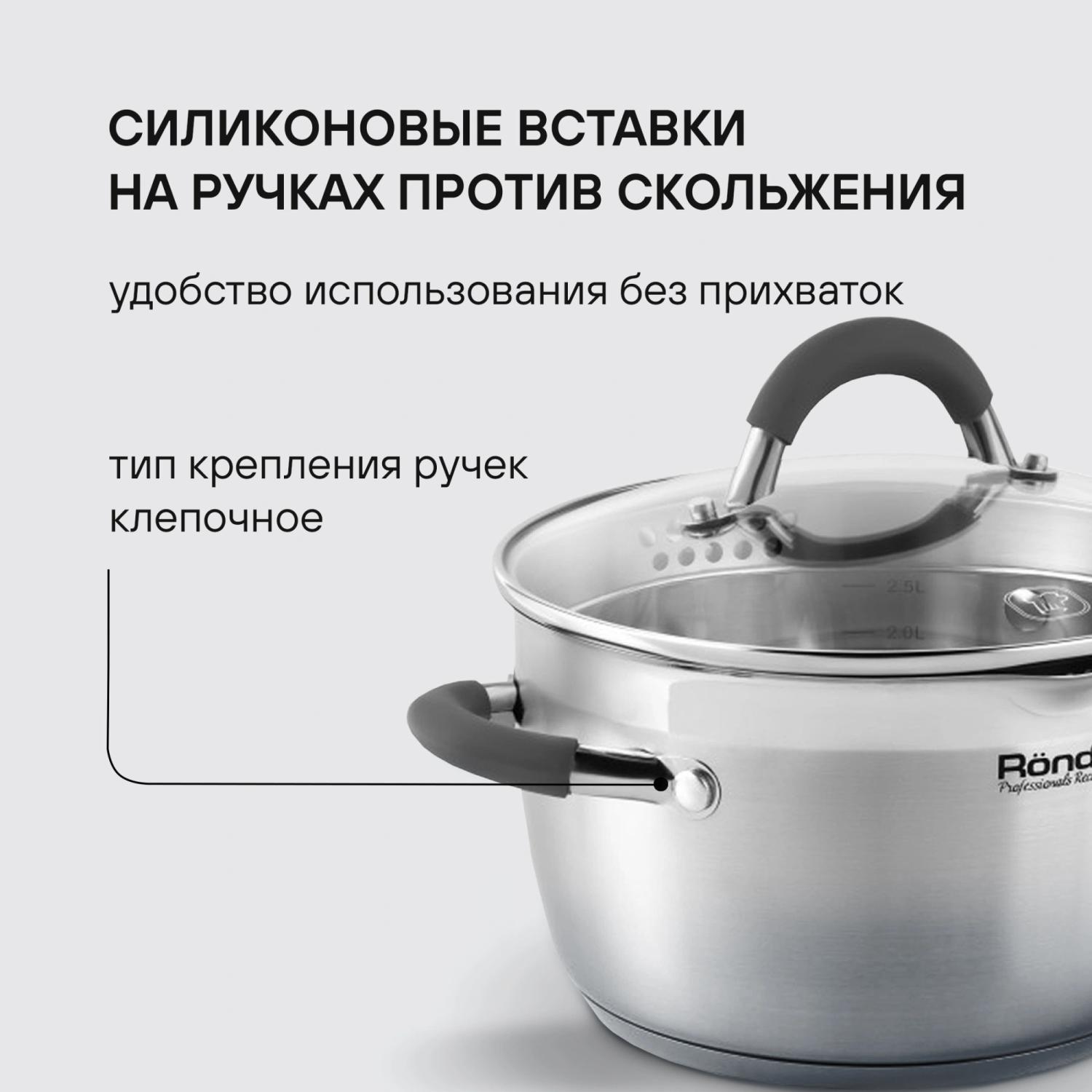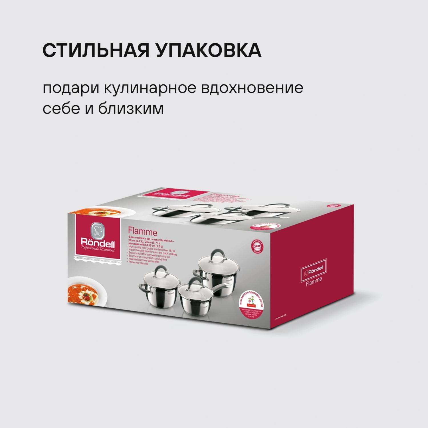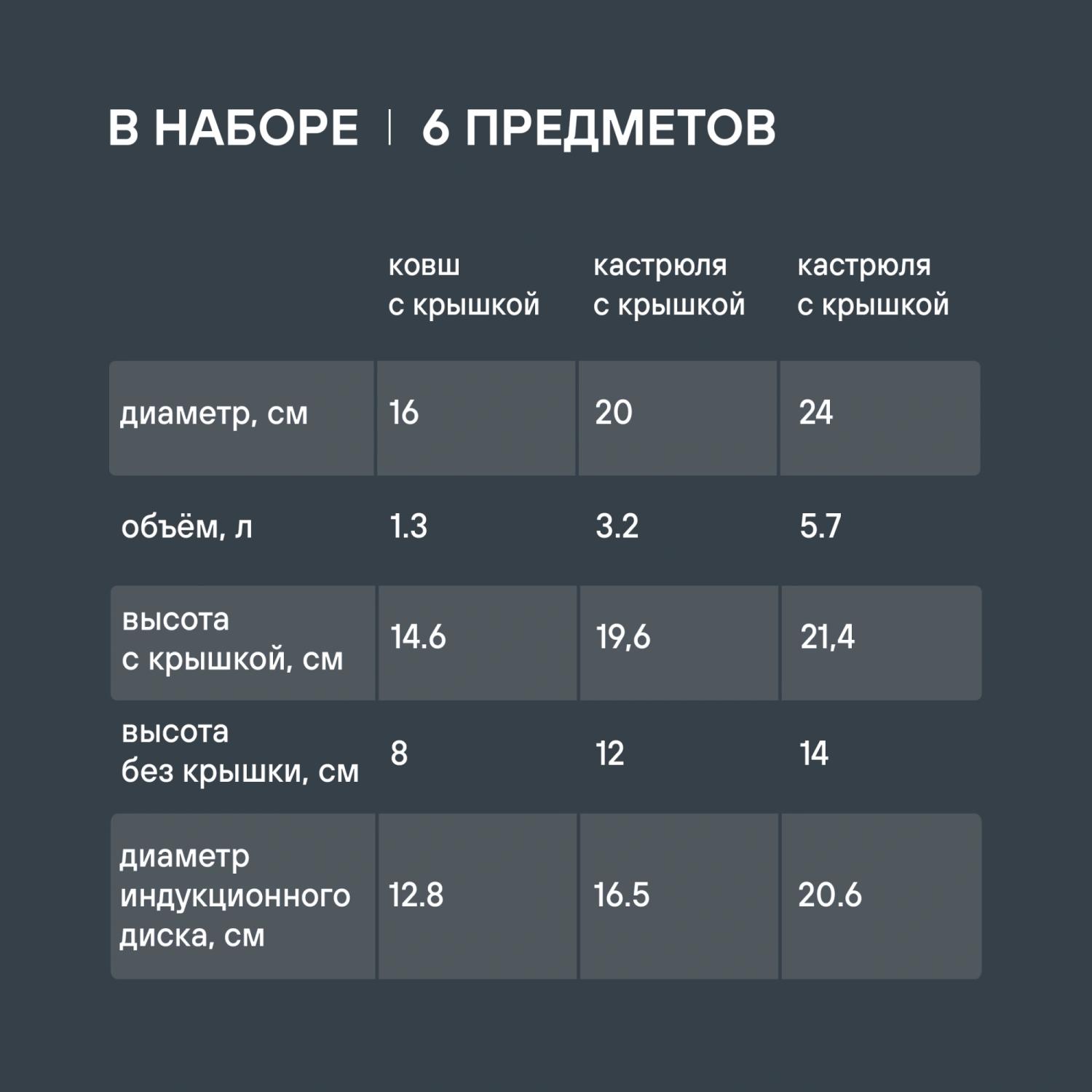 | Состав комплекта | Ковш 16 см (1,3 л), крышка 16 см, кастрюля с/кр. 20 см (3,2 л), кастрюля с/кр. 24 см (5,7 л) |