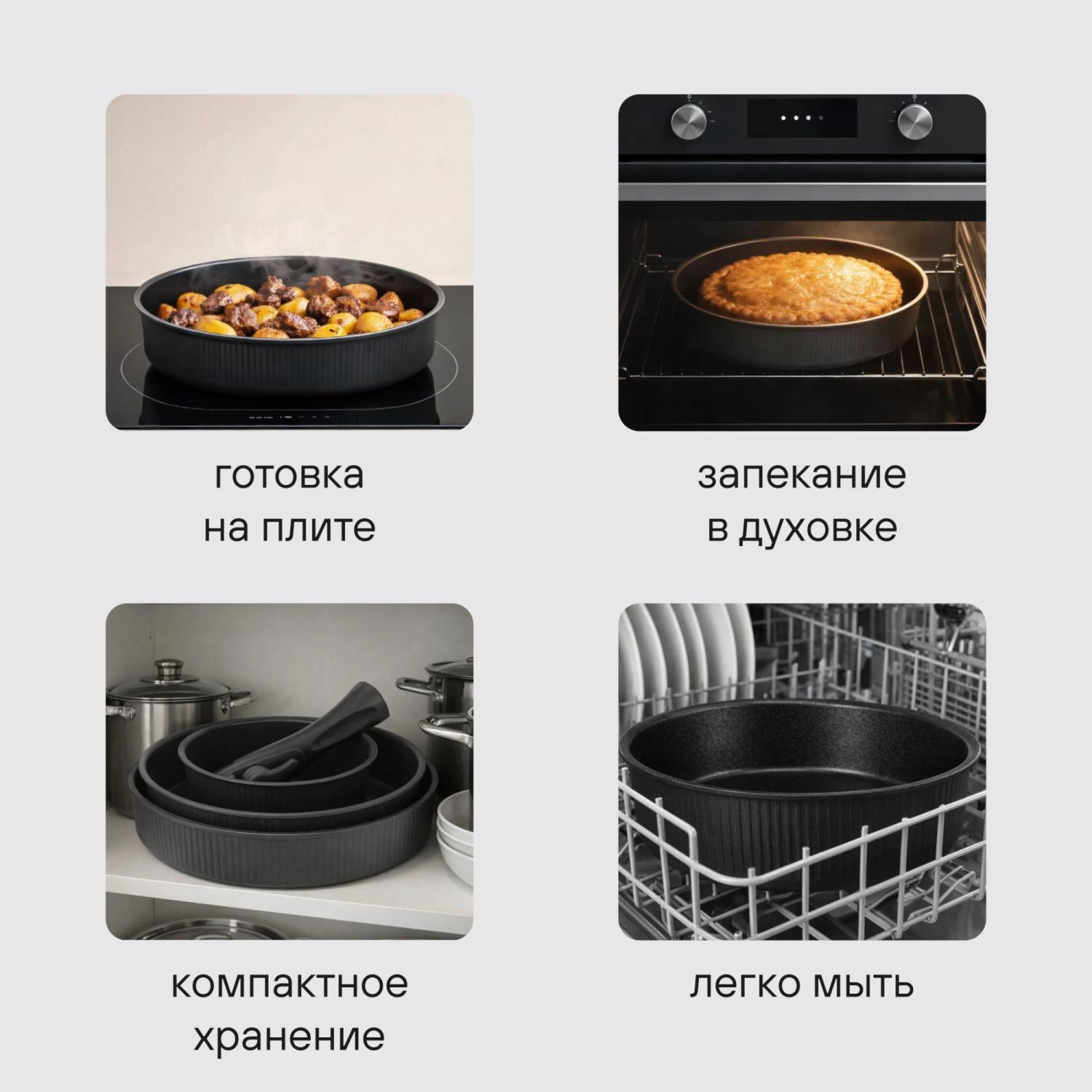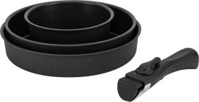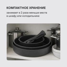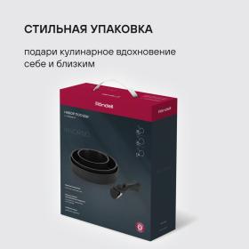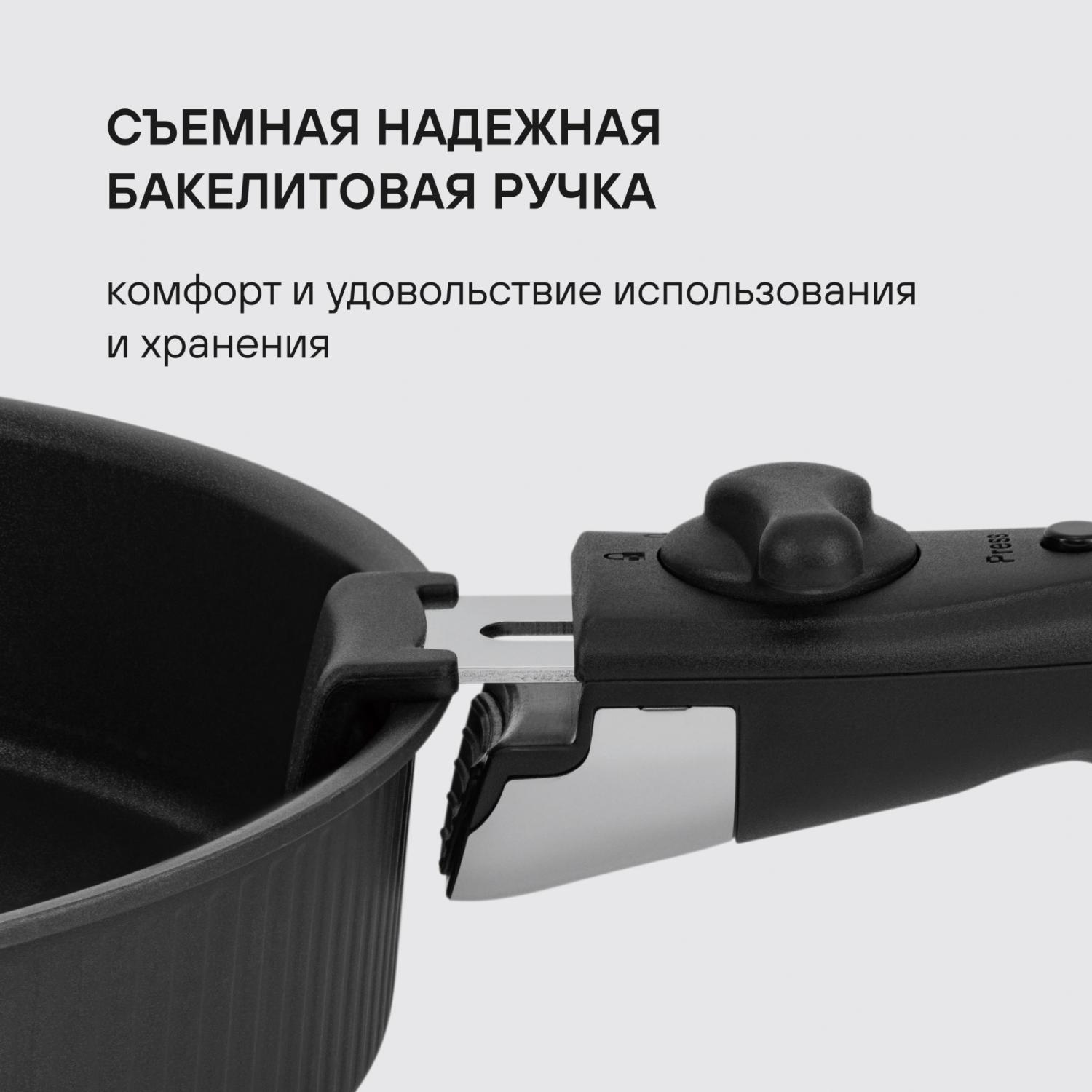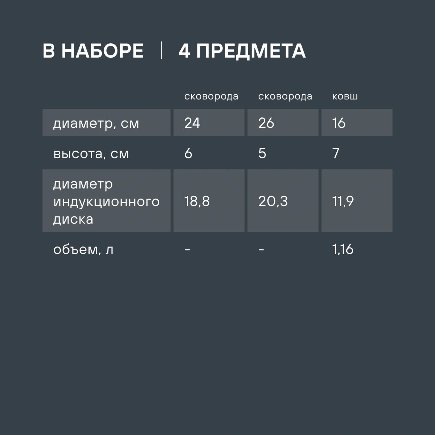 Состав комплекта сковорода глубокая 24х6 см, сковорода 26х5 см , ковш 16х7 см, съемная ручка