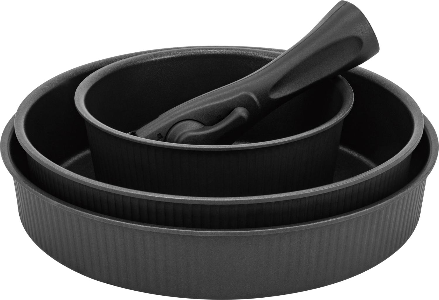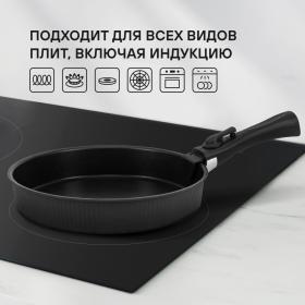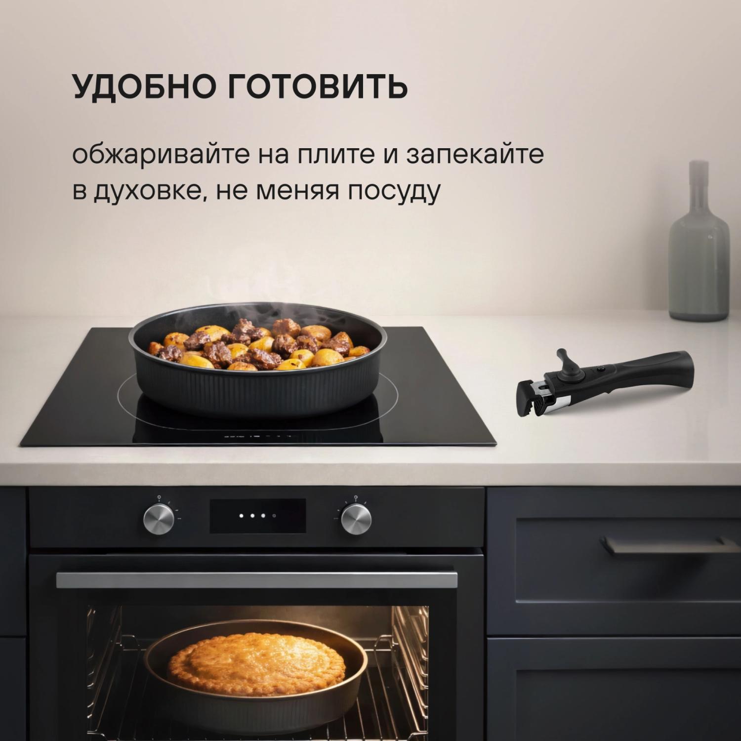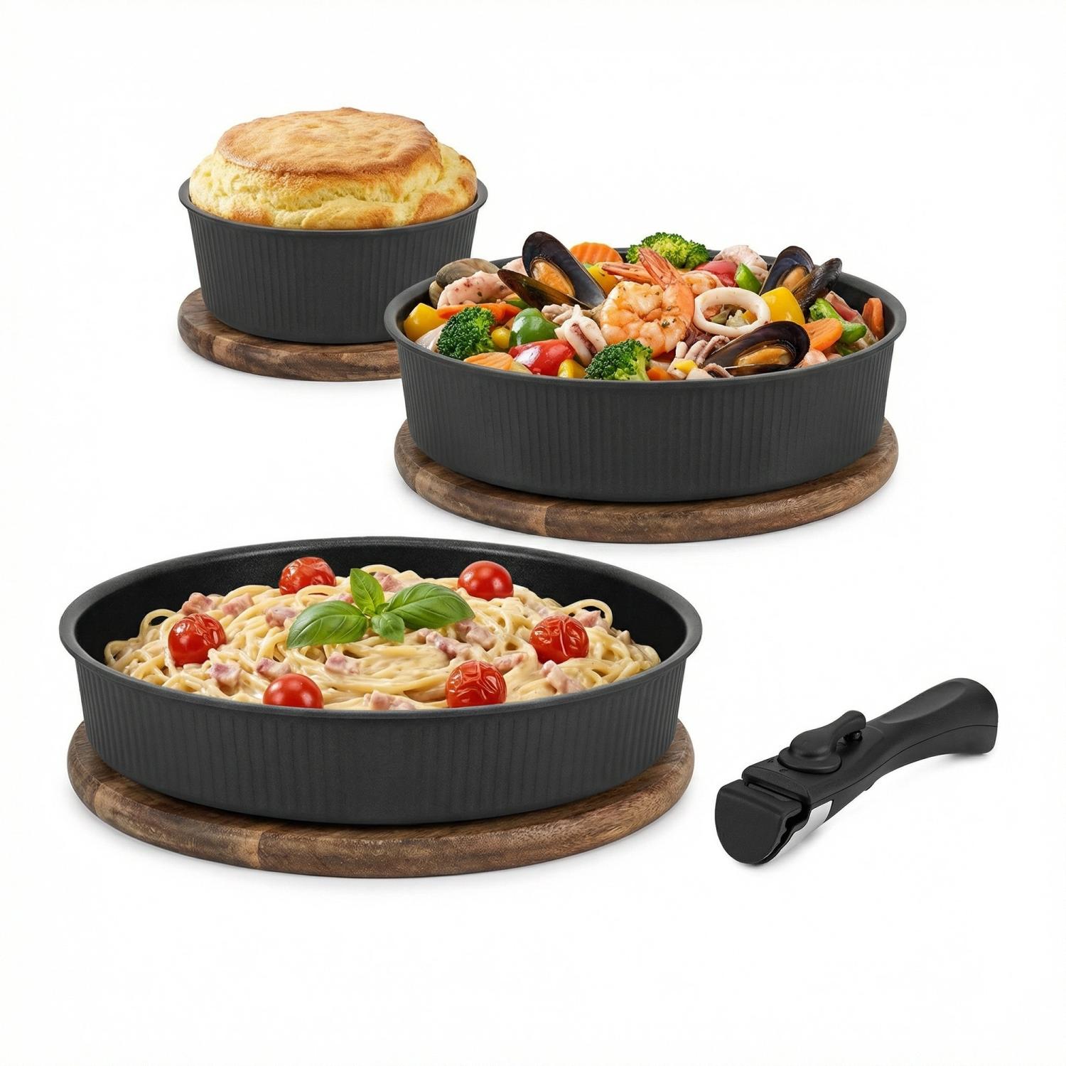 Состав комплекта сковорода глубокая 24х6 см, сковорода 26х5 см , ковш 16х7 см, съемная ручка
