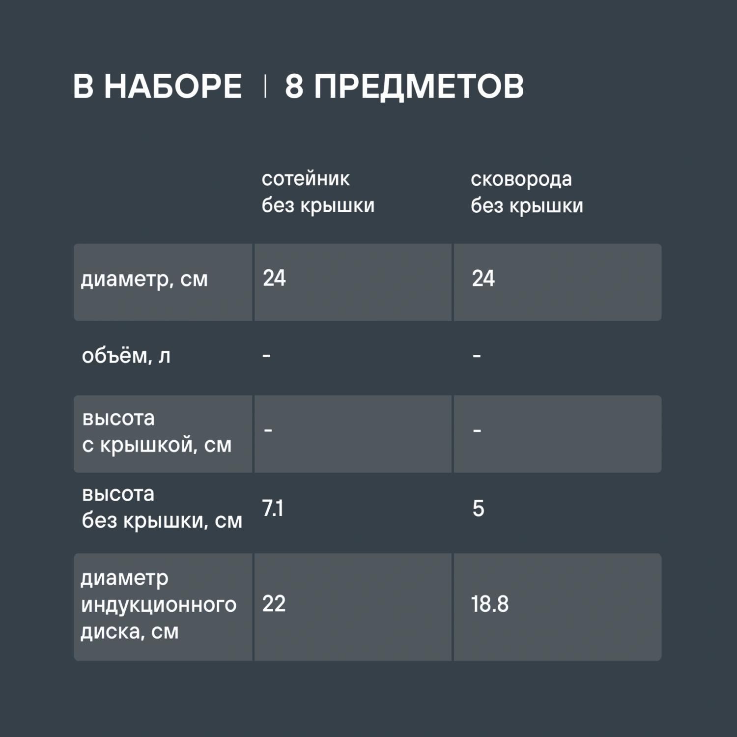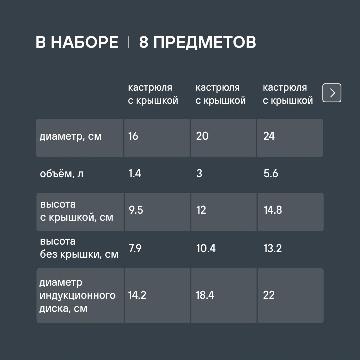 | Кастрюли в наборе | Две кастрюли 20см (3,0л), 24см (5,6л) со стеклянными крышками |