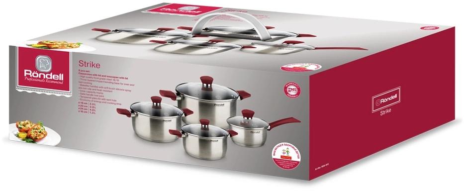 | Описание | Посуда коллекции Strike, изготовленная из высококачественной нержавеющей стали. Особому комфорту в работе способствуют ручки с покрытием Soft Touch, а внутренние отметки литража позволяют обходиться без использования мерных кружек. Цвет аксессуаров: в одном случае они серые, в другом красные. |