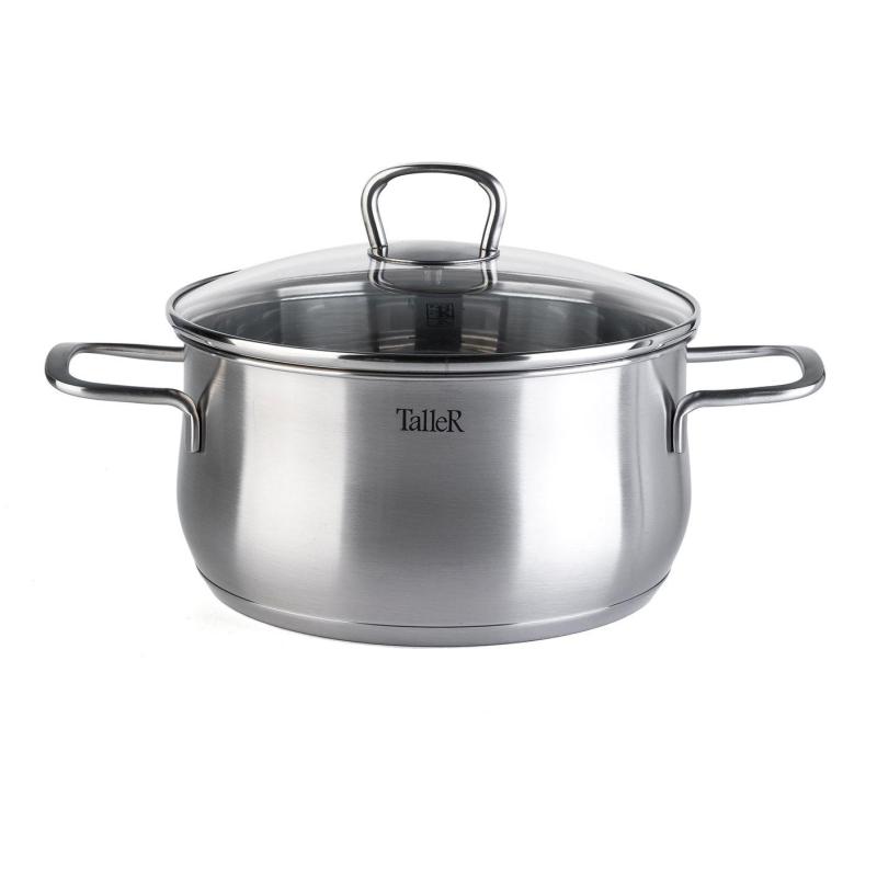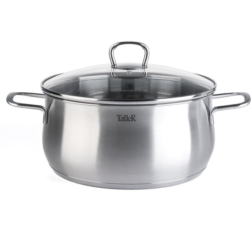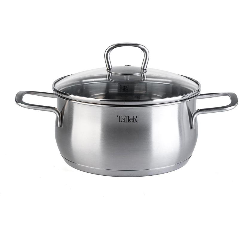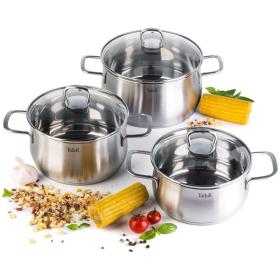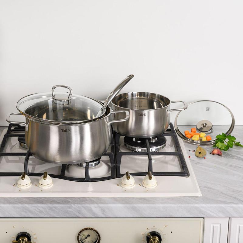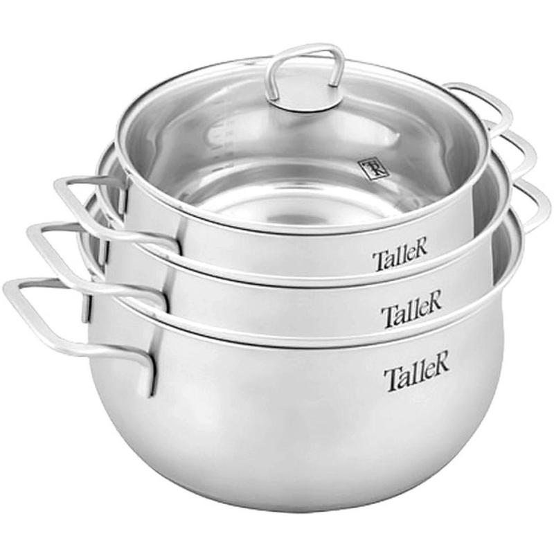 Набор посуды TalleR 17120 нержавеющая сталь 6 предметов. Состав: кастрюля 2.2 л с крышкой 18x9 см; кастрюля 3.2 л с крышкой 20x10.5 см; кастрюля 5.2 л с крышкой 24x11.5 см. Толщина стенки - 0.6 мм, толщина дна - 2.8 мм. Полировка матовая снаружи, зеркальная внутри. Крышки из жаропрочного стекла со стальным ободом с отверстием для выхода пара. Ручки из нержавеющей стали на сварке. Есть отметки литража. Набор посуды изготовлен из высококачественной нержавеющей стали марки 18/10: - обладает высокими антикоррозийными свойствами; - устойчив к воздействию кислот и щелочей; - не изменяет вкусовые качества, запах и цвет пищи, т.к. не вступает в реакцию с компонентами пищи. Оптимальная толщина стенок, многослойное капсулированное дно и плотно прилегающая крышка: - обеспечивает возможность приготовления пищи с минимальным количеством масла и воды; - максимально сохраняет натуральный вкус продуктов; - создает эффект ?русской печки?, сохраняя витамины, питательные и минеральные вещества. Капсулированное дно с алюминиевой вставкой: - обеспечивает быстрое нагревание и равномерное распределение тепла; - обладает термоаккумулирующими свойствами и сокращает время приготовления на 30%. Подходит для всех типов плит (включая индукционную). Пригоден для мытья в посудомоечной машине. Нельзя использовать в духовом шкафу. - перед первым использованием требуется тщательно промыть изделия; - хранить изделия в чистом, сухом виде; - не рекомендуется использовать губки с абразивным слоем; - не рекомендуется промывка изделий в посудомоечной машине с использованием моющих средств, в состав которых входит активный кислород.