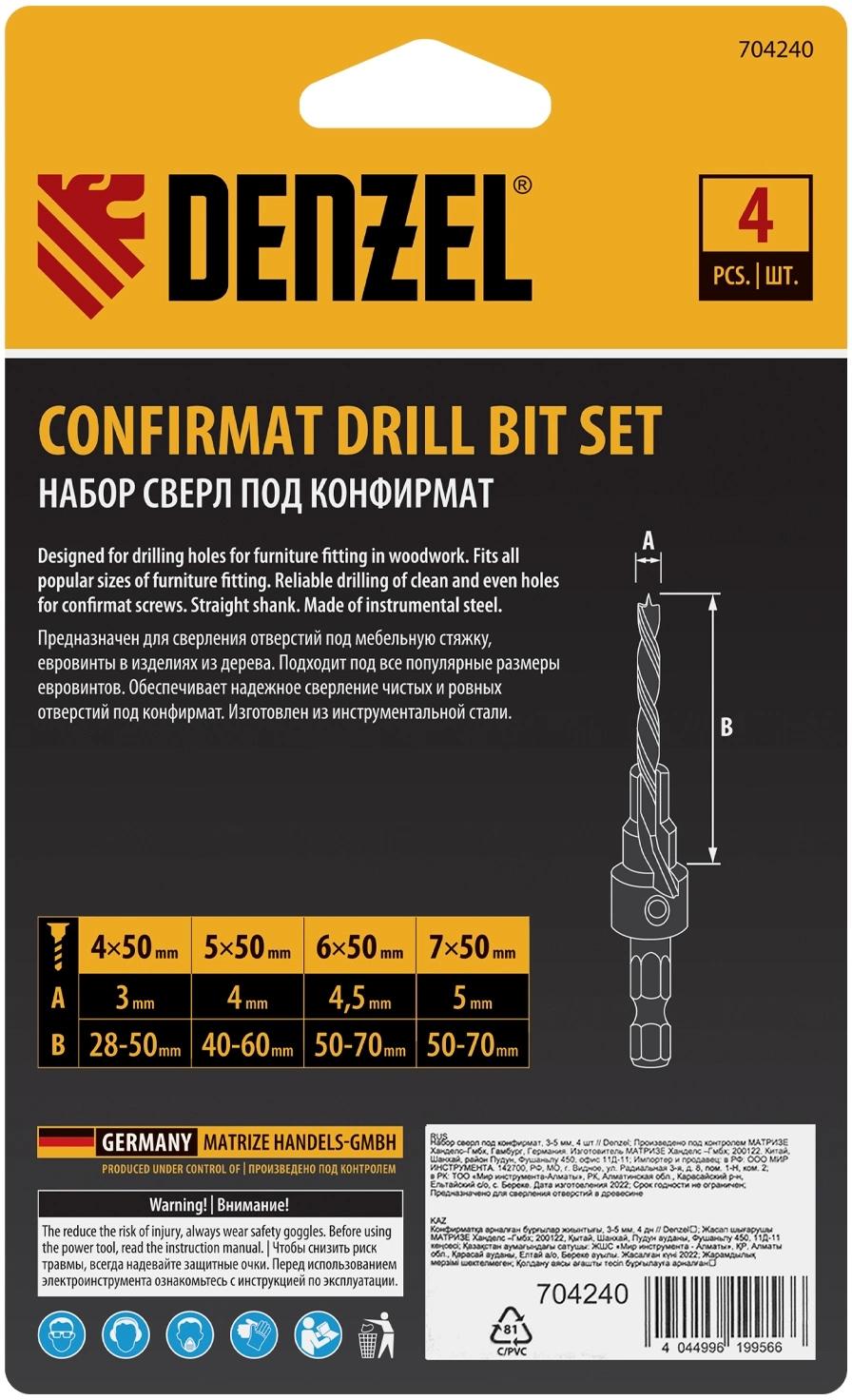 | Состав набора | Набор сверл под конфирмат Denzel 704240 включает 4 оснастки диаметром 3-5 мм, предназначенные для получения отверстий под евровинты в древесине, фанере и ДСП. Сверла устанавливаются в патрон электрической дрели или сверлильного станка и подходят для конфирматов размером 4х50, 5х50, 6х50 и 7х50 мм. |
