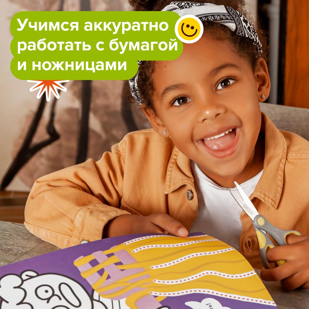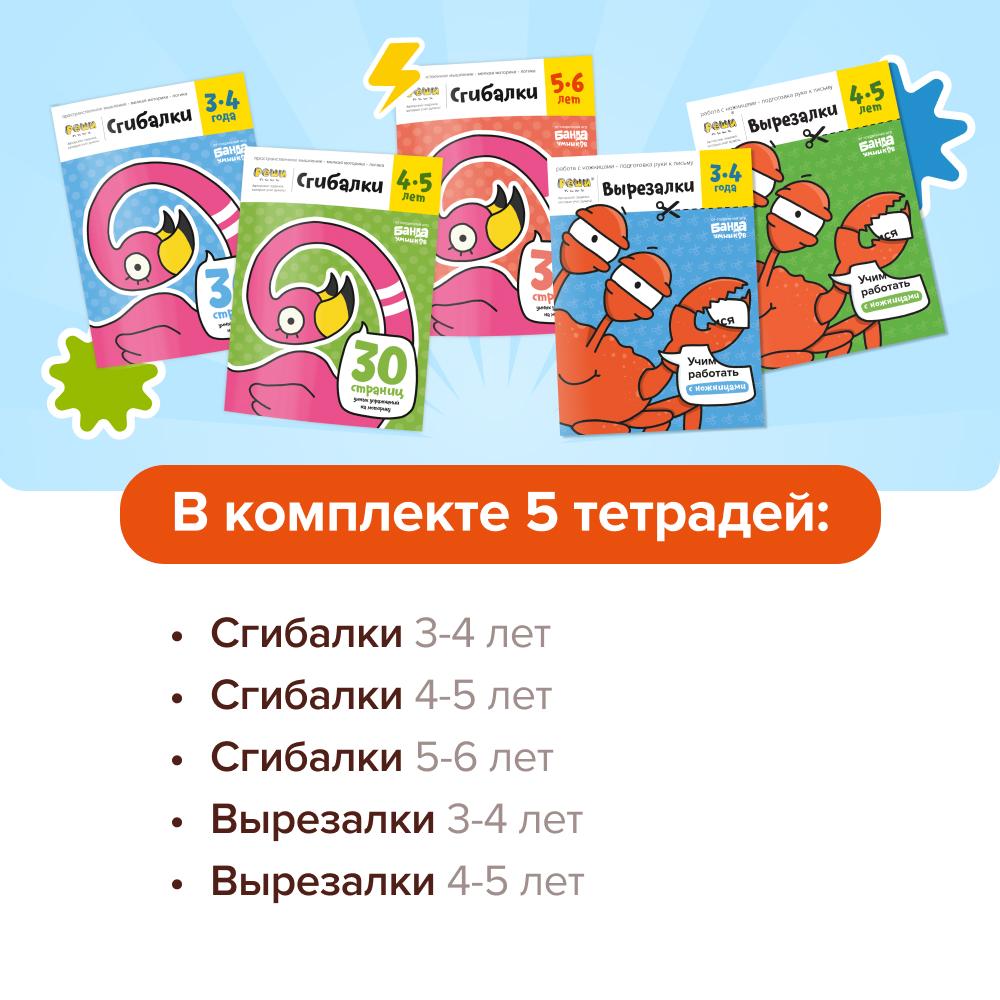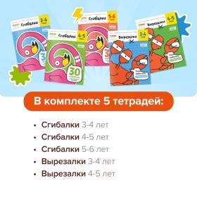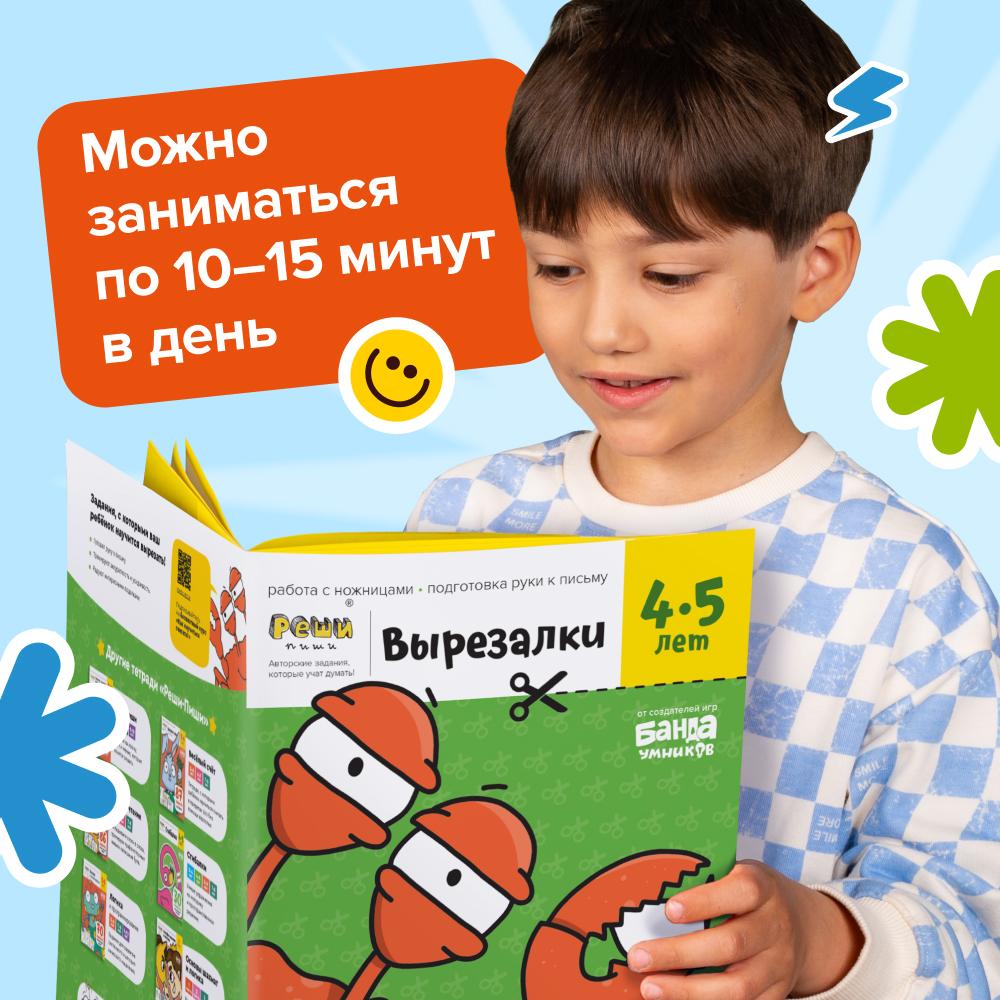 - Тетрадь "Вырезалки, 4–5 лет". Задания становятся сложнее: разрезанный лист превращается в небольшую поделку с интересным сюжетом. Осваивая навык работы с ножницами, дети развивают мелкую моторику, готовят руку к письму, учатся работать со сложным инструментом, тренируют внимательность и аккуратность.
