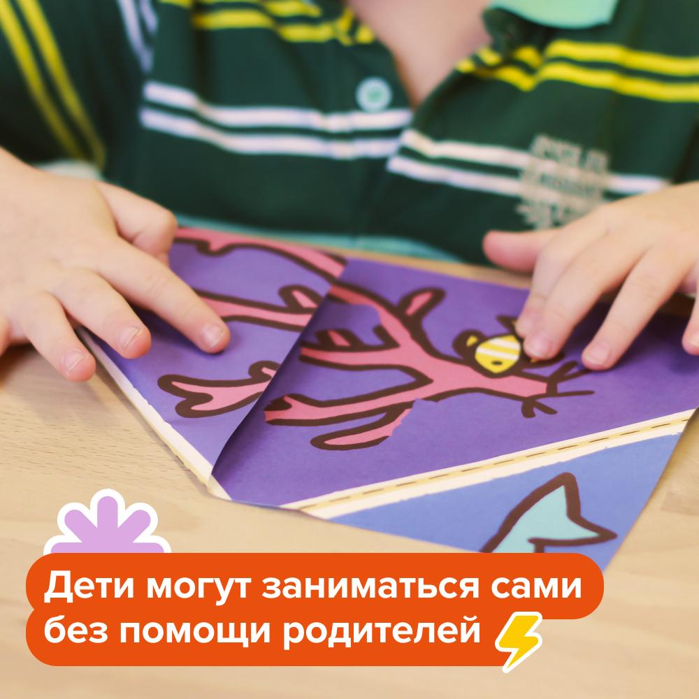 - Тетрадь "Сгибалки, 5–6 лет". В третьей тетради для создания рисунка надо сделать уже три сгиба. Тут нужно не только точно сгибать по пунктиру, а заодно решить логическую задачку: в какой именно последовательности нужно сгибать кусочки.