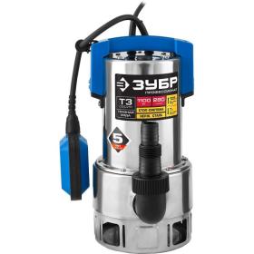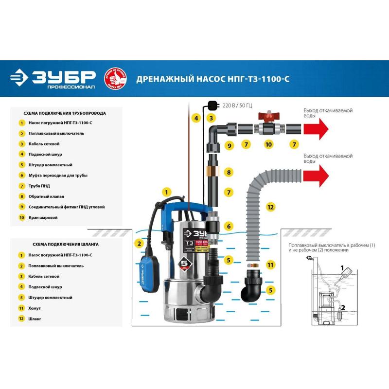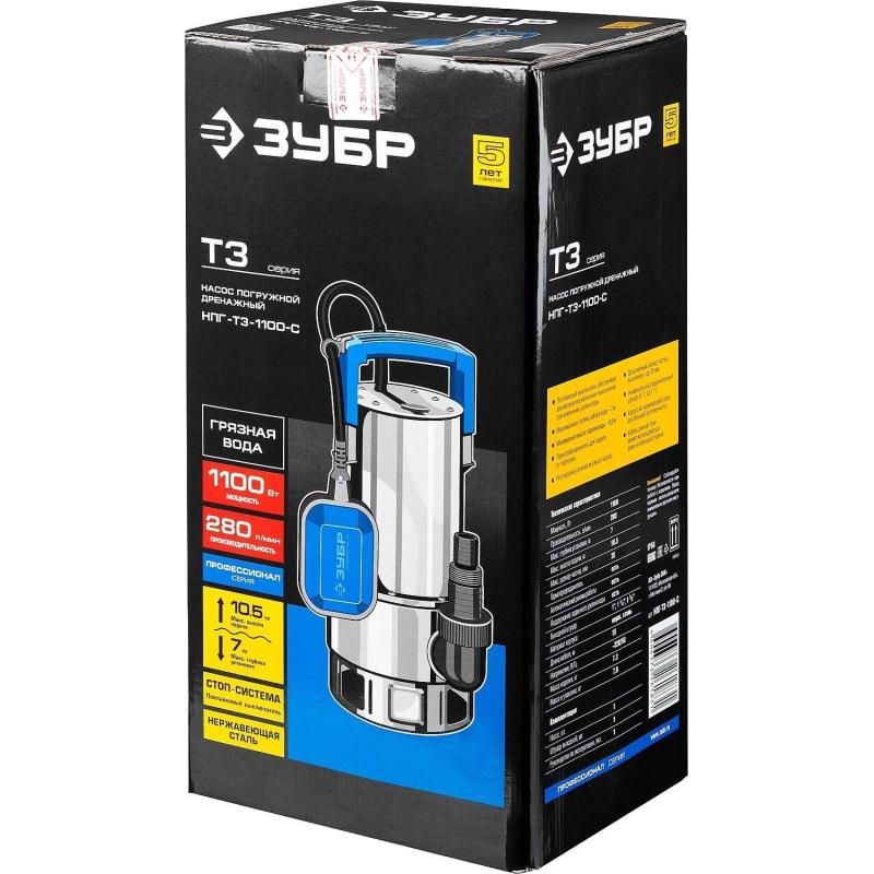 Насос дренажный для грязной воды Зубр Профессионал НПГ-Т3-1100-С<br><br>Автоматическое включение и выключение, термопредохранитель для защиты двигателя, высокие эксплуатационные свойства и простота конструкции обеспечивают надёжное и безопасное применение для перекачивания чистой воды на садовых участках, при осушении ёмкостей и водоёмов, организации забора воды с глубины (колодцы, скважины) и подачи на высоту, использовании в системах аэрации и дренажа. Для увеличения срока службы насоса используются материалы только высокого качества. При помощи этого насоса вы без труда решите поставленную задачу.<br><br>Применение<br>Для автоматического перекачивания воды из ёмкостей и водоёмов, организации забора воды с колодцев, скважин и подачи на высоту. Допускается использование насоса в загрязнённой воде.<br><br>Преимущества<br>• Универсальный насос способен перекачивать чистую и загрязнённую воду с допускаемым размером частиц включений мягких фракций до 35 мм<br>• Двигатель с медной обмоткой имеет увеличенный ресурс, позволяющий использовать изделие в интенсивном режиме более 5 лет<br>• Корпус из нержавеющей стали и высокое качество комплектующих гарантируют стабильность работы и длительный срок службы<br>• Поплавковый выключатель обеспечивает автоматическое вкл/выкл при изменении уровня воды<br>• Регулировка уровней вкл/выкл насоса<br>• Термопредохранитель для защиты от перегрева<br>• Износостойкая рабочая крыльчатка гарантирует тихую и бесперебойную работу<br>• Универсальный соединительный штуцер от 1″ до 1 1/4″ для шлангов и от G1″ до G1 1/2″ для трубопроводов<br>• Кабель длиной 10 м, который может использоваться даже на большой глубине<br><br>Стандартная гарантия 3 года. Расширенная гарантия на 5 лет доступна только при условии использования товара в бытовых целях, прохождения периодического обслуживания в авторизованном сервисном центре, при регистрации инструмента на сайте производителя в течение 4-х недель с момента покупки.<br><br>Внешний вид и/или характеристики товара могут быть изменены производителем в соответствии с производственным процессом.