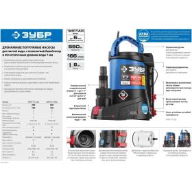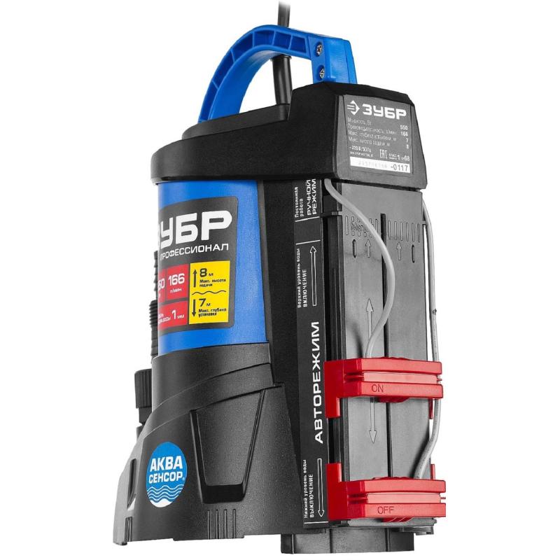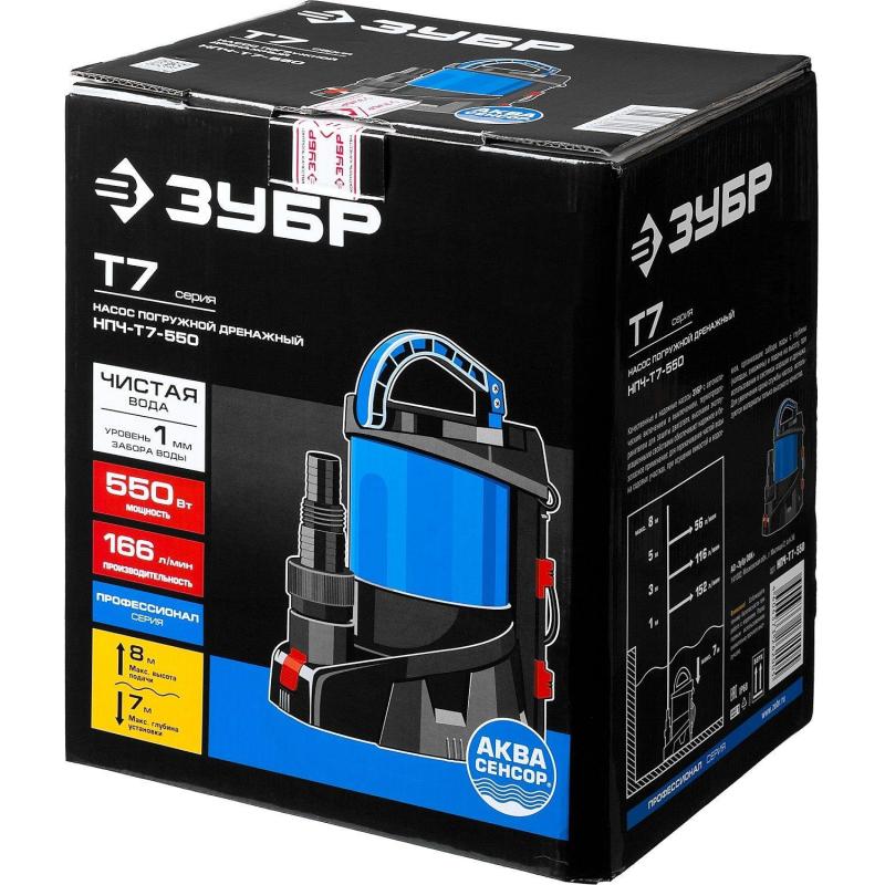 Насос дренажный для чистой воды Зубр Профессионал НПЧ-Т7-550<br><br>Автоматическое включение и выключение, термопредохранитель для защиты двигателя, высокие эксплуатационные свойства и простая конструкция обеспечивают надёжное и безопасное применение для перекачивания чистой и загрязнённой воды на садовых участках, при осушении ёмкостей и водоёмов, организации забора воды с глубины (колодцы, скважины) и подачи на высоту, использовании в системах аэрации и дренажа. Для увеличения срока службы насоса используются материалы только высокого качества. При помощи этого насоса вы без труда решите поставленную задачу.<br><br>Применение<br>Для автоматического перекачивания воды из ёмкостей и водоёмов, организации забора воды с колодцев, скважин и подачи на высоту.<br><br>Преимущества<br>• Откачивание жидкости до остаточного уровня 1 мм, т.е. практически досуха<br>• Встроенные датчики уровня воды АкваСенсор обеспечивают автоматическое включение/выключение насоса<br>• Допускаемый размер частиц включения — до 5 мм<br>• Возможность работы в ручном (постоянное включение) и в автоматическом режиме<br>• Ударопрочный корпус насоса изготовлен из гигиенического армированного стекловолокном пластика<br>• Встроенный обратный клапан предотвращает разлив жидкости после выключения насоса и сокращает время всасывания при повторном запуске<br>• Износостойкая крыльчатка гарантирует тихую и бесперебойную работу<br>• Универсальный соединительный штуцер от 1″ до 1 1/4″ для шлангов и от G1″ до G1 1/2″ для трубопроводов<br>• Кабель длиной 10 м может использоваться даже на большой глубине<br>• Термопредохранитель для защиты двигателя от перегрева<br><br>Стандартная гарантия 3 года. Расширенная гарантия на 5 лет доступна только при условии использования товара в бытовых целях, прохождения периодического обслуживания в авторизованном сервисном центре, при регистрации инструмента на сайте производителя в течение 4-х недель с момента покупки.<br><br>Внешний вид и/или характеристики товара могут быть изменены производителем в соответствии с производственным процессом.