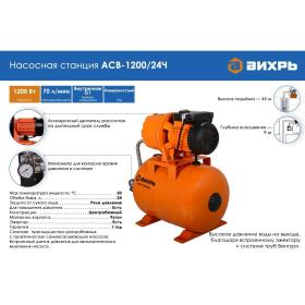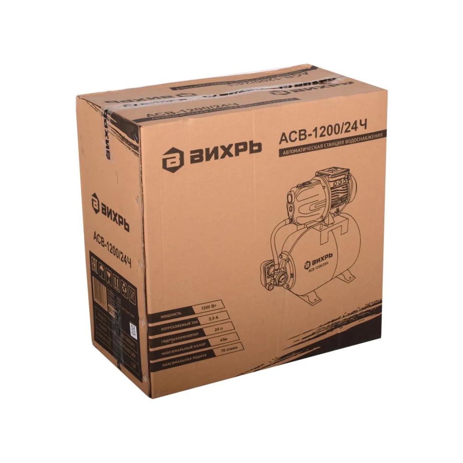 Насосная станция Вихрь <nobr>АСВ-1200</nobr>/24Ч (68/1/9)<br><br> Данная модель предназначена для бесперебойного водоснабжения коттеджей, дач, ферм и в автоматическом режиме поддерживает необходимое давление в системе водоснабжения. Она обладает хорошими параметрами напора и подачи воды при небольшой сравнительно не большой мощности<br><br>Преимущества модели:<br>Наличие тепловой защиты.<br>При сбое с подачей воды или длительного использования на максимальной нагрузке защитная автоматика обесточит насос.<br>Автоматическое включение (падение давления в АСВ до 1,5 атм.) и выключение (давление в баке 3 атм.)<br>Специальные крепления АСВ для дополнительной устойчивости.<br>Встроенный внутренний эжектор с системой труб позволяет перекачивать воду с меньшими, по сравнению с обычными центробежными насосами, требованиями к чистой воде и наличию в ней растворенных газов, а также обеспечивает функцию самовсасывания.<br>Наличие металлической резьбы на входном и выходном отверстиях.<br><br>Материал корпуса: чугун.<br>Тип соединения со шлангом: внутренняя G1 дюйм.<br>Мощность двигателя: 1200 Вт.<br>Обьем бака: 24 л.<br>Оптимальные условия окружающей среды: от -10 до 40 градусов. <br>Максимальное давление: 3 атм.<br><br><!--noindex-->Внешний вид и/или характеристики товара могут быть изменены производителем в соответствии с производственным процессом.<!--/noindex-->