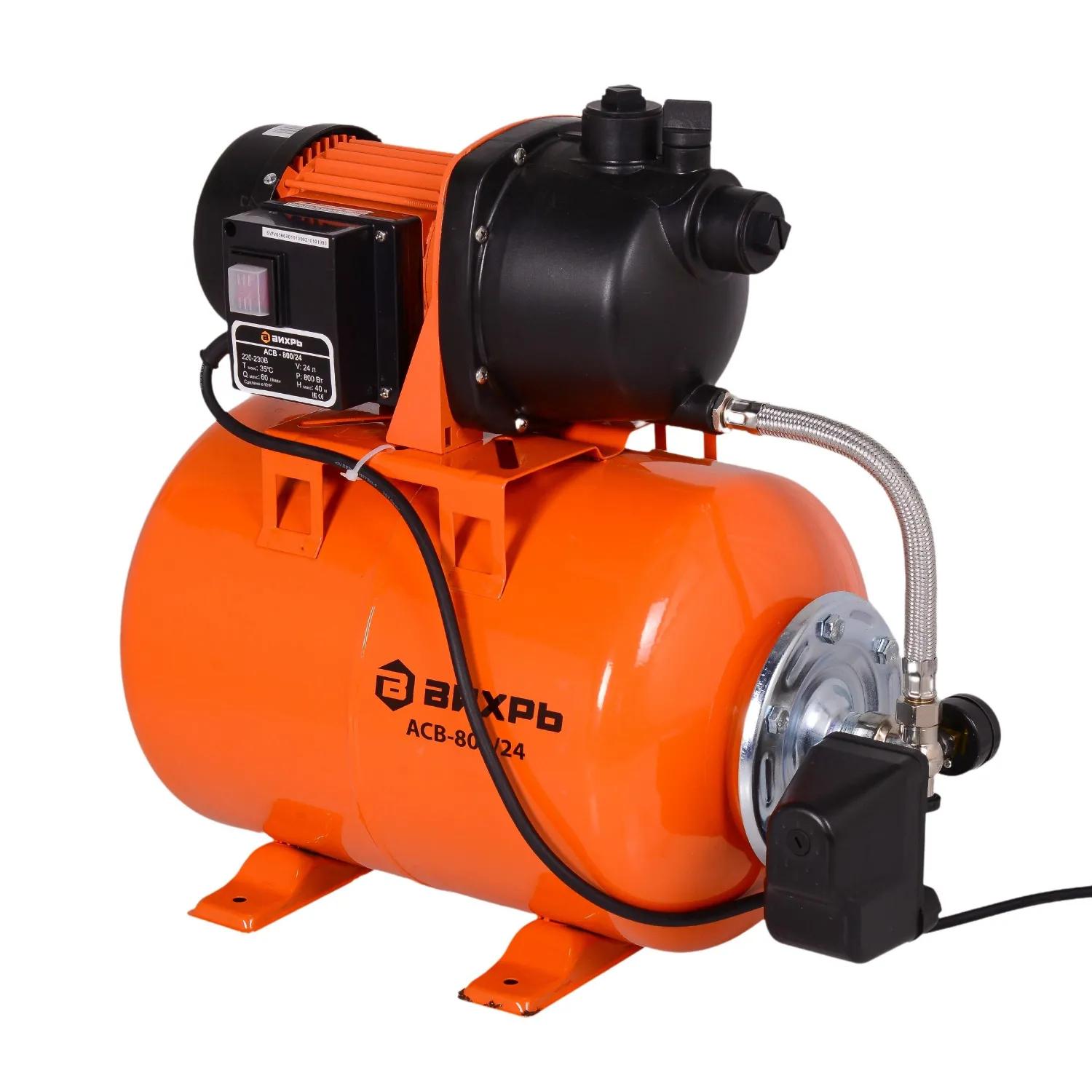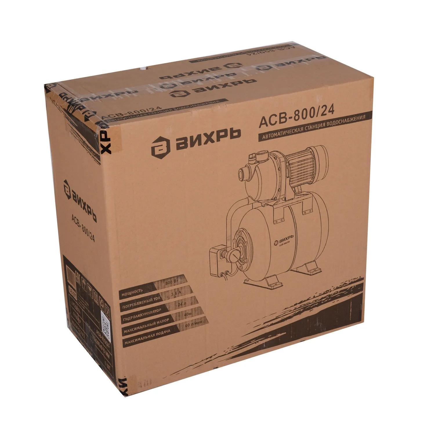 Насосная станция Вихрь АСВ- 800/24 (68/1/1)<br><br> Данная модель предназначена для бесперебойного водоснабжения коттеджей, дач, ферм и в автоматическом режиме поддерживает необходимое давление в системе водоснабжения. Она обладает хорошими параметрами напора и подачи воды при небольшой сравнительно не большой мощности<br><br>Преимущества модели:<br>Наличие тепловой защиты.<br>При сбое с подачей воды или длительного использования на максимальной нагрузке защитная автоматика обесточит насос.<br>Автоматическое включение (падение давления в АСВ до 1,5 атм.) и выключение (давление в баке 3 атм.)<br>Специальные крепления АСВ для дополнительной устойчивости.<br>Встроенный внутренний эжектор с системой труб позволяет перекачивать воду с меньшими, по сравнению с обычными центробежными насосами, требованиями к чистой воде и наличию в ней растворенных газов, а также обеспечивает функцию самовсасывания.<br>Наличие металлической резьбы на входном и выходном отверстиях.<br><br>Материал корпуса: пластик.<br>Тип соединения со шлангом: внутренняя G1 дюйм.<br>Мощность двигателя: 800 Вт.<br>Обьем бака: 24 л.<br>Оптимальные условия окружающей среды: от -10 до 40 градусов.<br>Максимальное давление: 3 атм.<br><br><!--noindex-->Внешний вид и/или характеристики товара могут быть изменены производителем в соответствии с производственным процессом.<!--/noindex-->