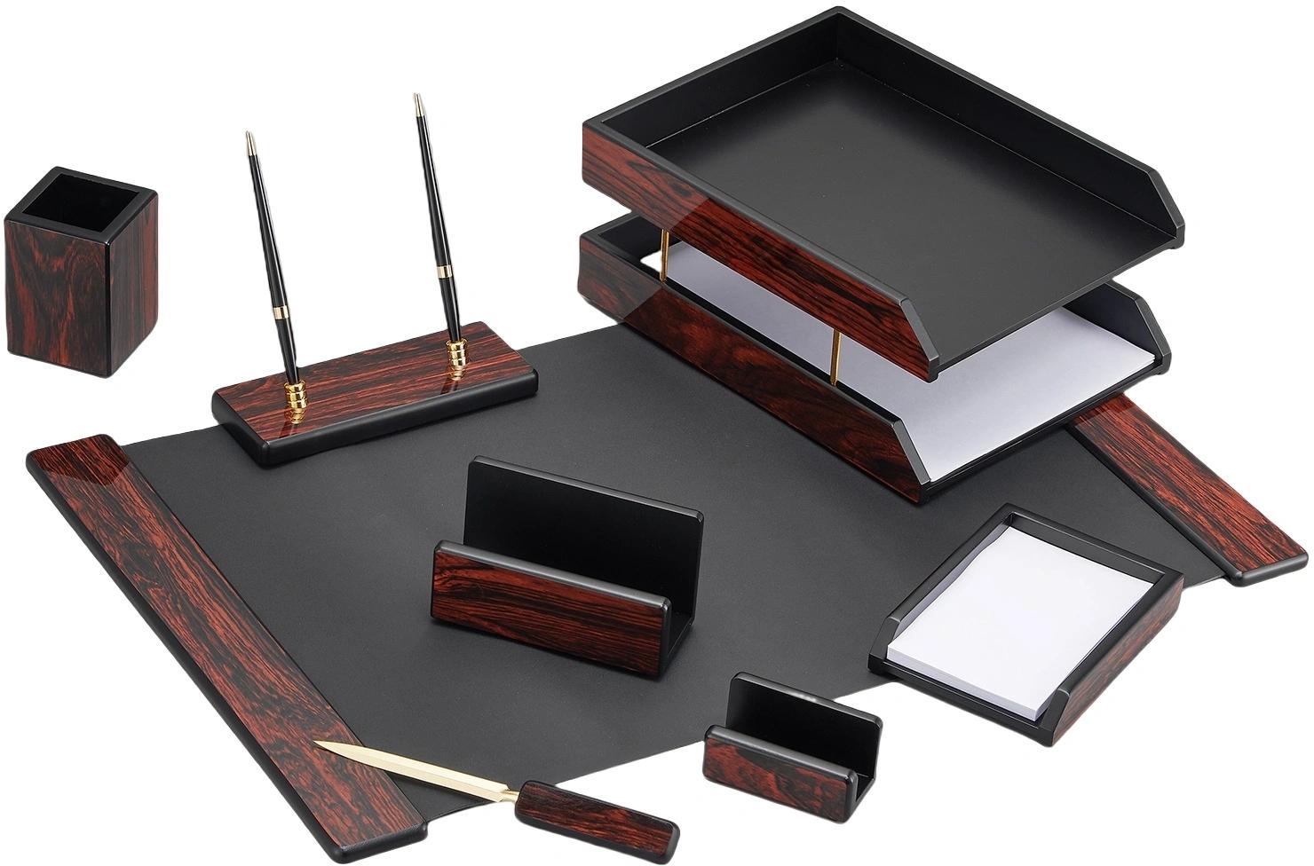 | Состав набора | подкладка на стол, подставка для ручек с двумя ручками, лоток для блокнота, визитница,стаканчик для ручек, нож для писем, подставка для писем, лоток для бумаг |